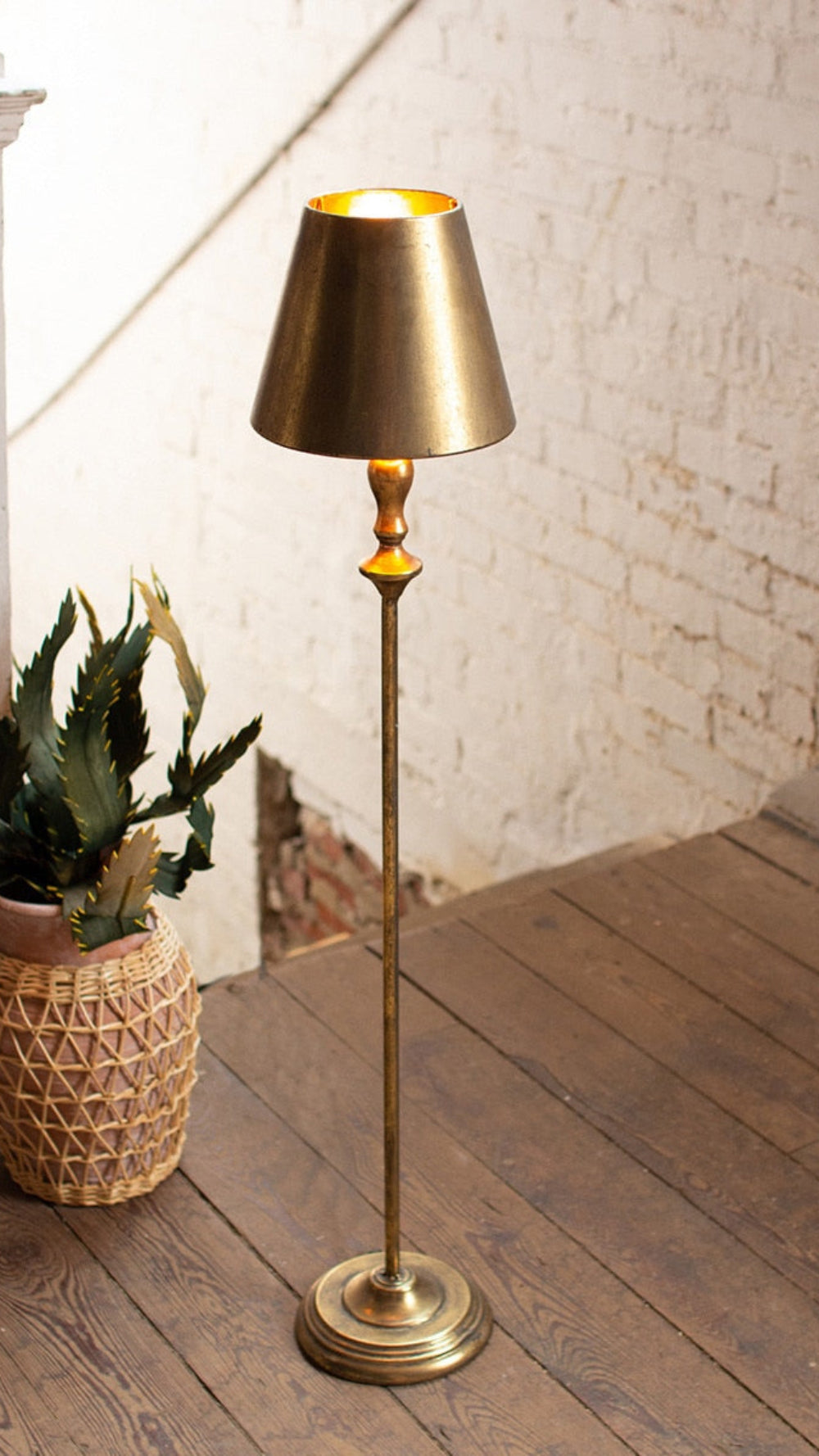 This antique gold table lamp adds height and character to living rooms, offices, and bedside spaces. Designed with a durable metal body and a coordinating metal shade, it provides focused, downward lighting ideal for reading, accents, or work surfaces. The lamp measures 8" diameter x 40" tall, creating a slim yet visually impactful profile that fits well on side tables, consoles, and desks. Its antique gold finish complements traditional, transitional, and modern decor styles. The sturdy construction ensures long-lasting use, while the metal shade enhances light direction and clarity. A functional lighting piece suitable for both decorative and practical applications. Made by Kalalou.