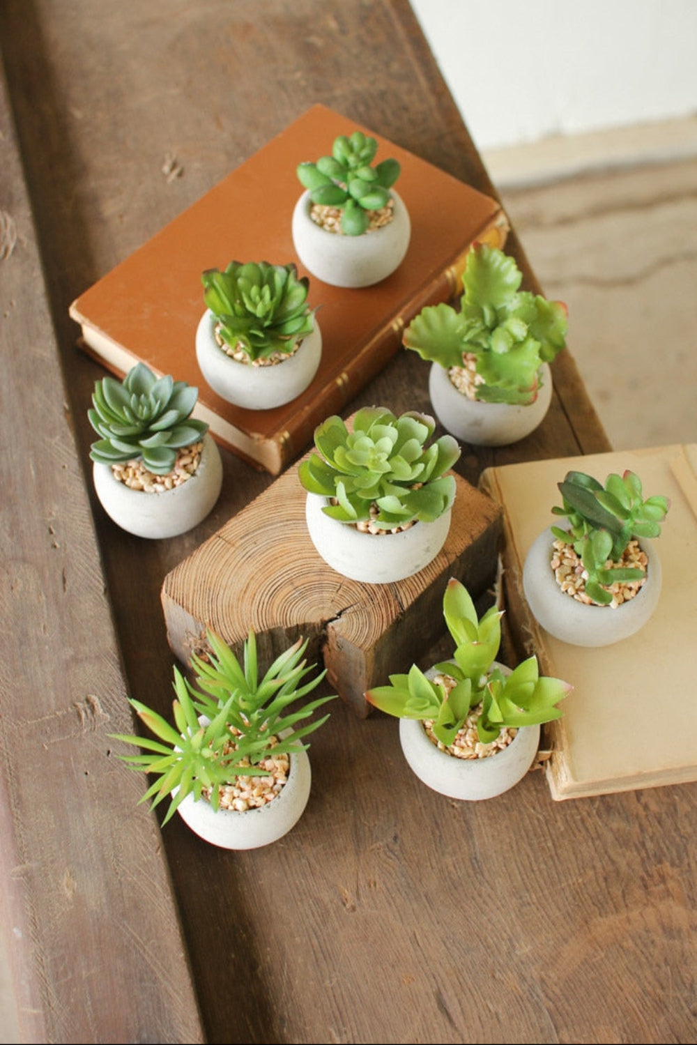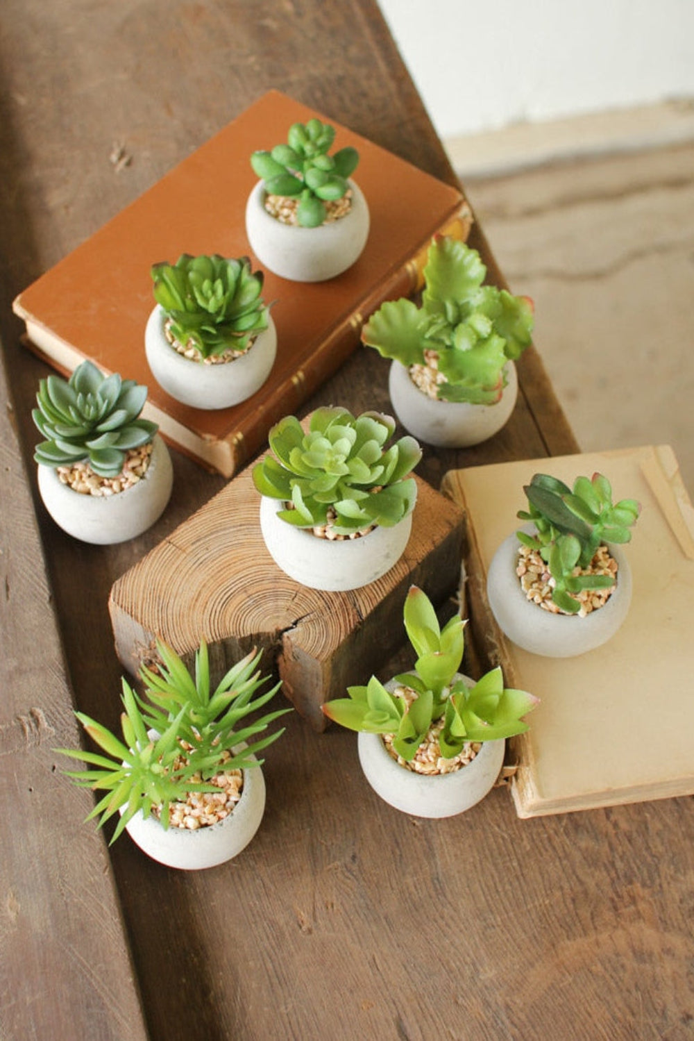 - Includes 8 small faux succulents in durable cement pots.