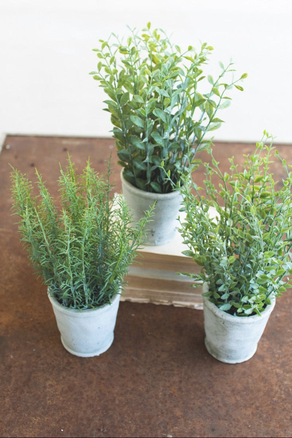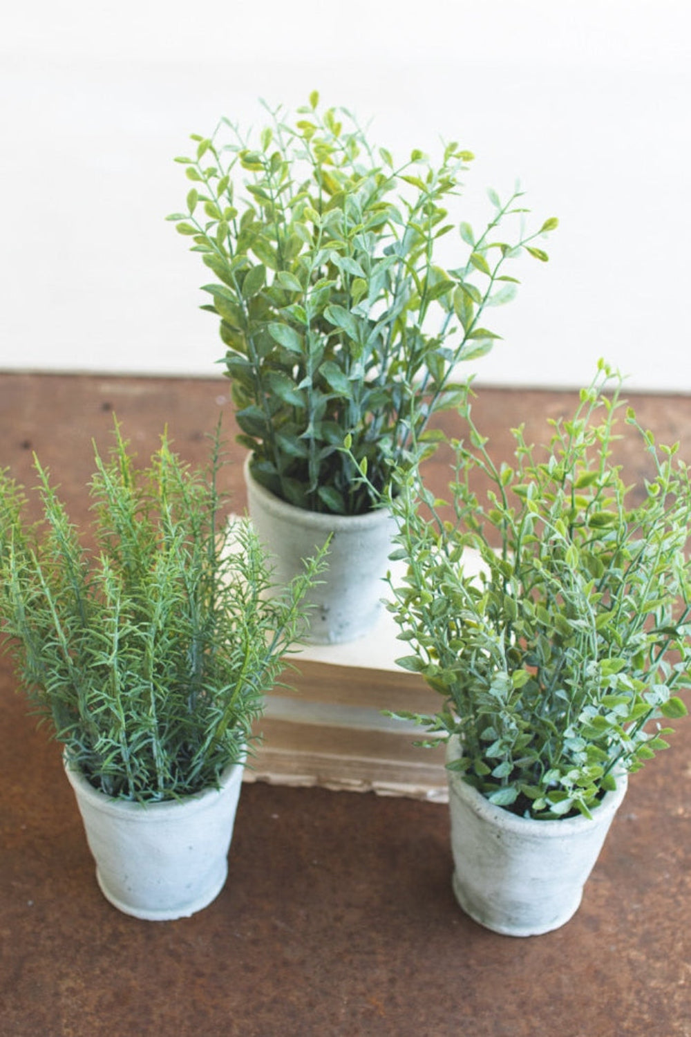 - Includes 3 artificial herb plants in decorative cement pots.