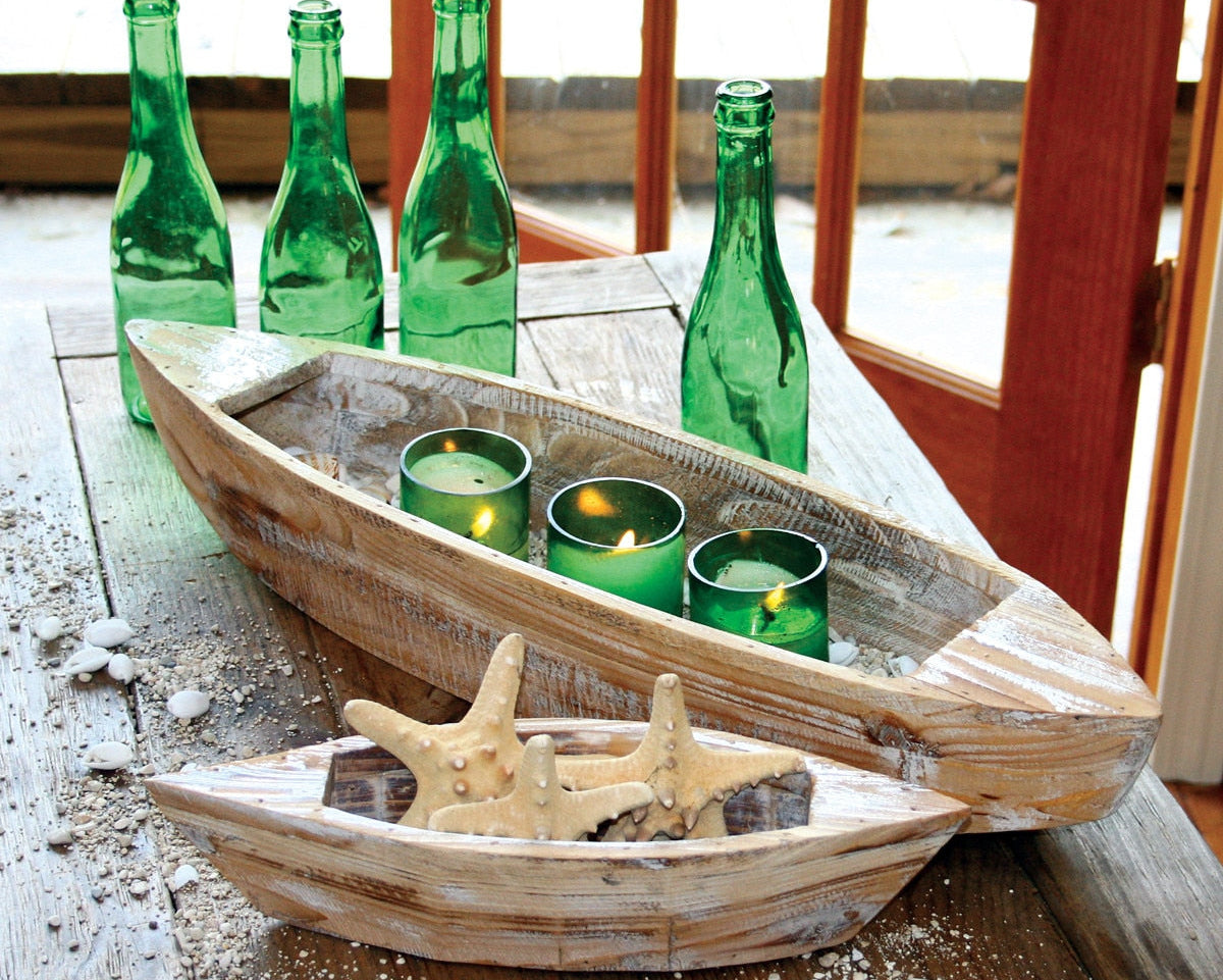 - Distressed wooden boat designs add instant coastal charm