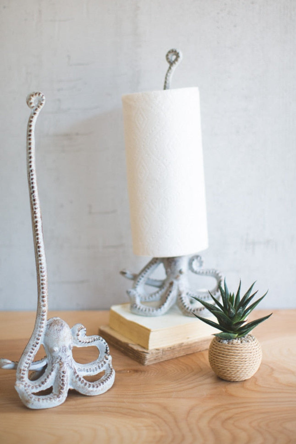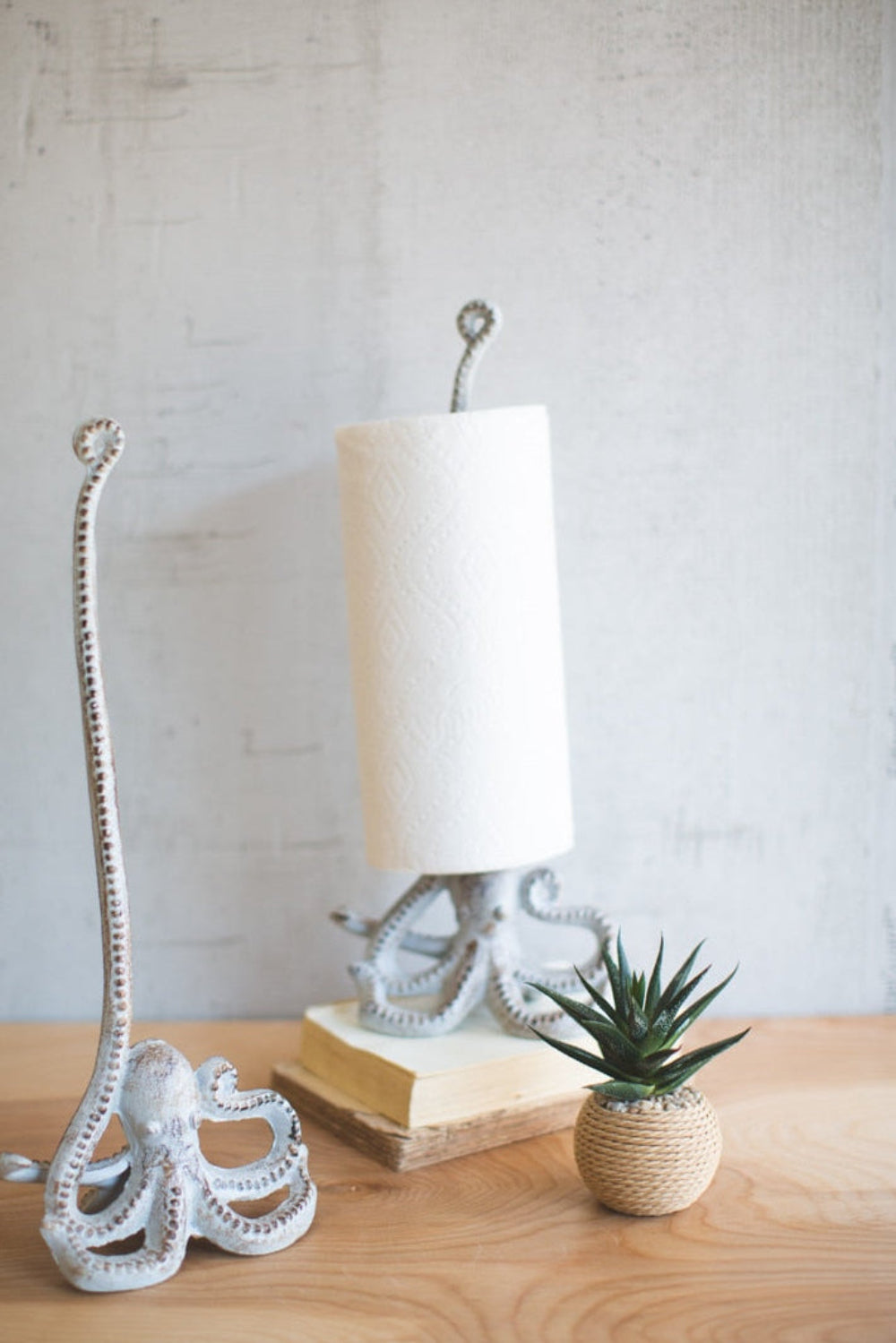 Add coastal charm and character to your kitchen or bath with the Kalalou Cast Iron Octopus Paper Towel Holder. Crafted from sturdy cast iron with a distressed gray finish, this whimsical octopus design brings a touch of seaside personality to your décor. Perfect for coastal, farmhouse, or nautical themes, it keeps your paper towels easily accessible while doubling as a charming decorative piece.