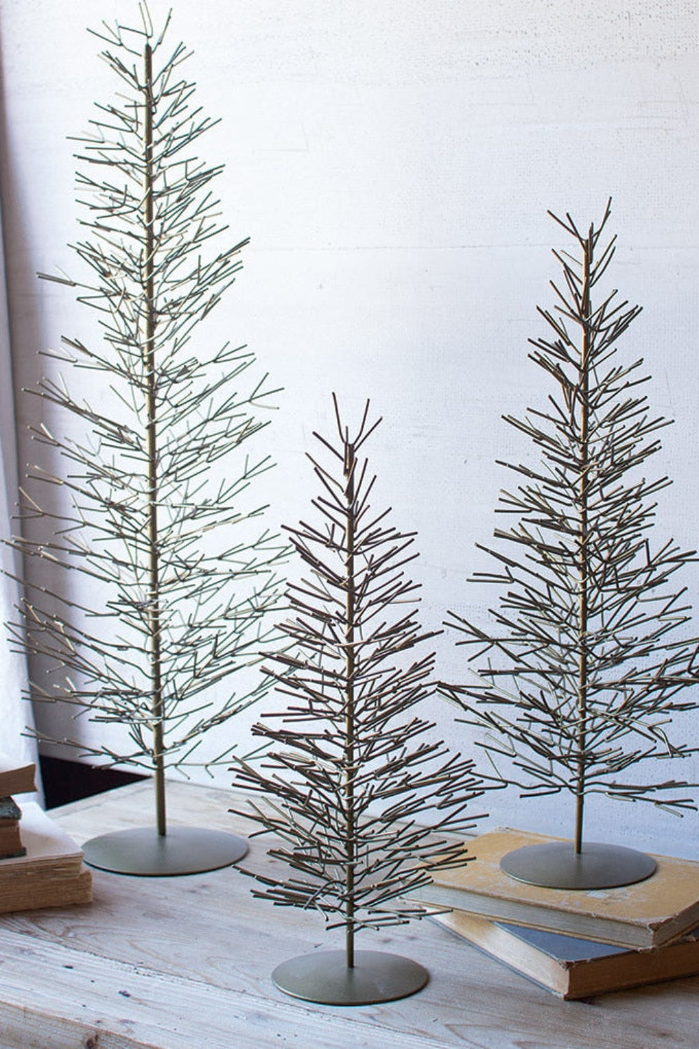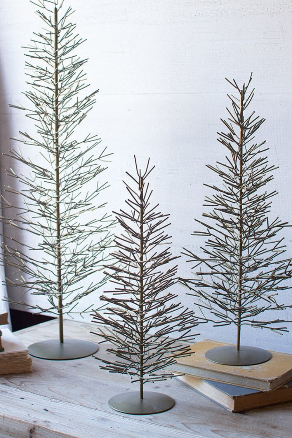 Add height, sparkle, and sculptural charm to your seasonal décor with this set of three antique brass wire trees. The tallest piece stands at 30 inches, supported by coordinated medium and small trees that create a balanced holiday display. Their open-wire design in a warm gold finish complements classic, modern, rustic, and minimalist holiday styles.