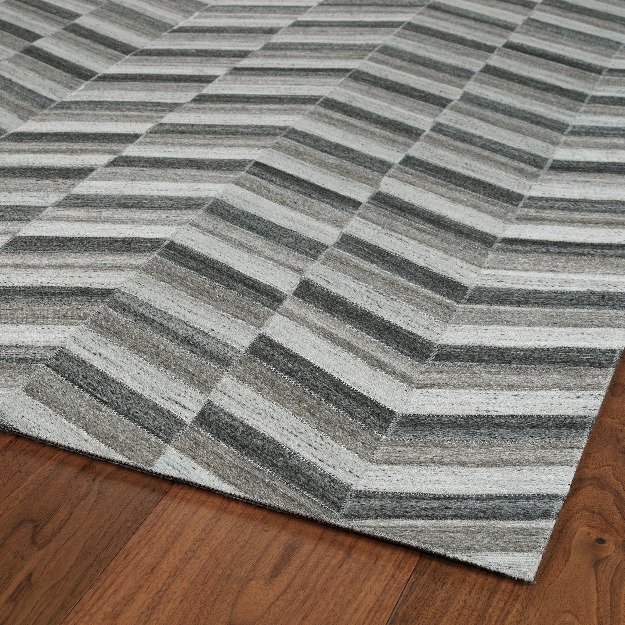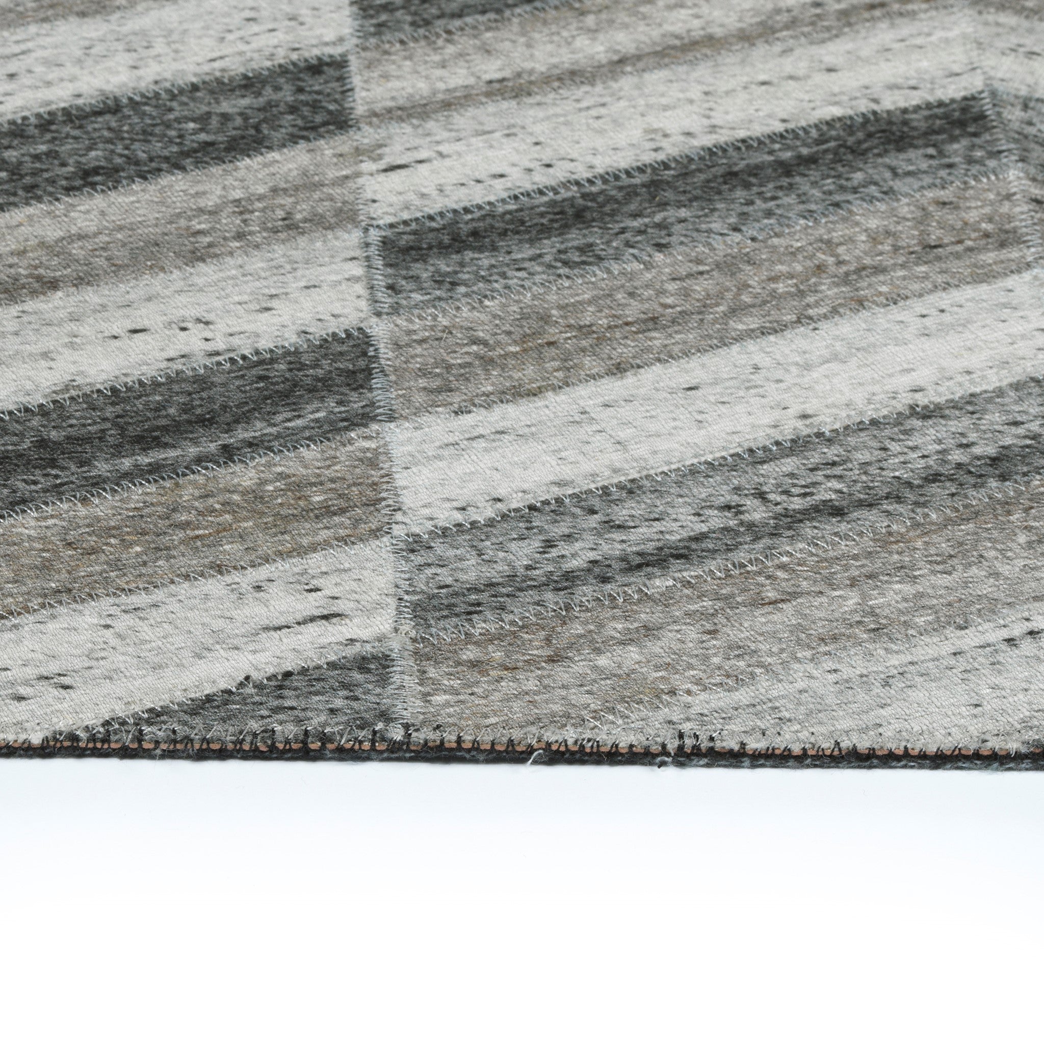 Animal friendly, our new Chaps collection captures a complex look while keeping the animals safe. Cowhide replication for a sophisticated high-end showstopper. Handmade in India using a Viscose and Wool blend. Detailed colors in this rug are Charcoal,Grey,Silver,Beige,Taupe,Black.