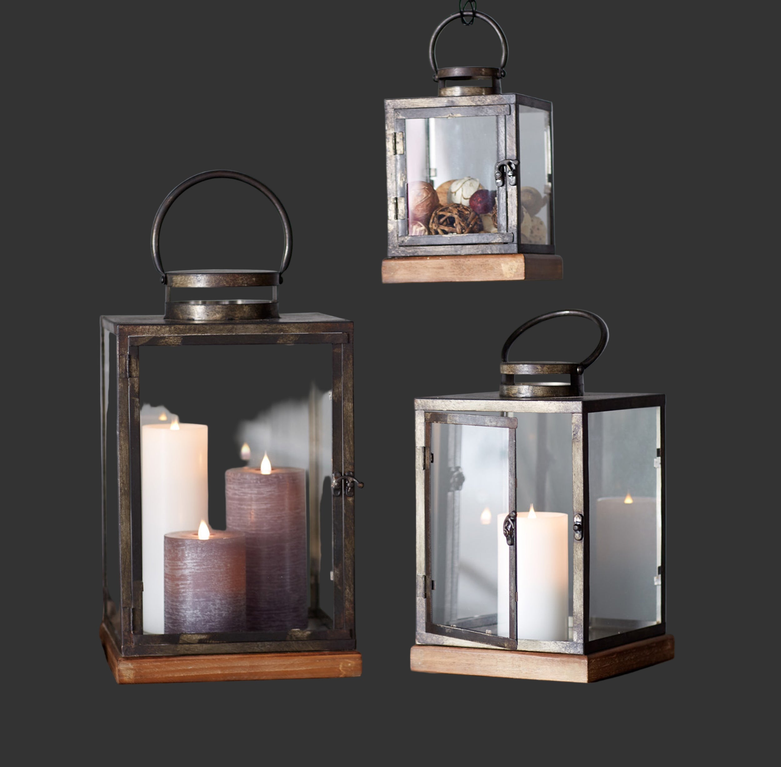 Lantern Set with Wood Base 12 Inch Height Metal and Glass Decorative Holders By Melrose