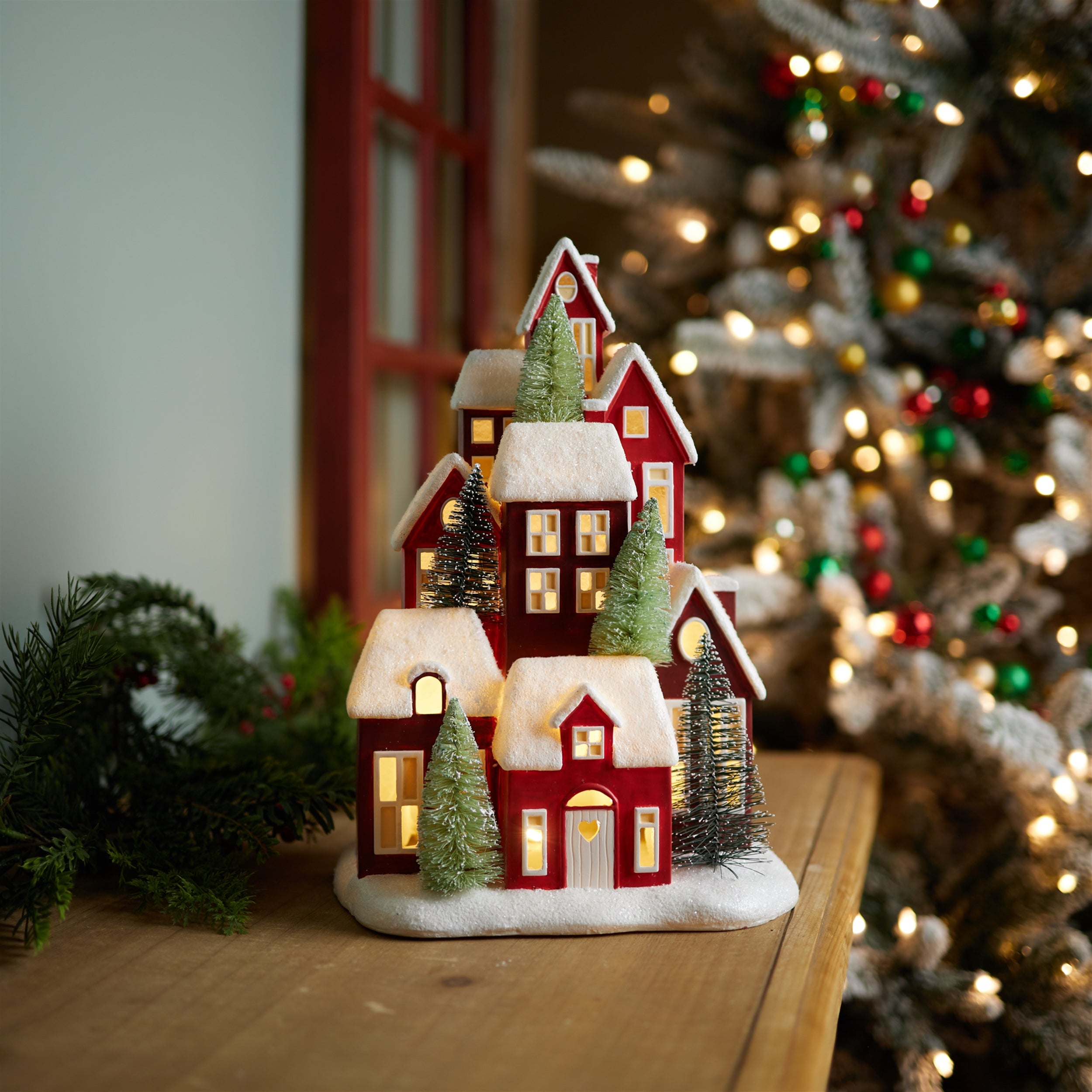 Create a warm and inviting holiday glow with this charming LED Houses Decor. Crafted from durable resin, this festive village features classic red houses with snowy rooftops, glowing windows, and bottle-brush tree accents for a nostalgic winter look. Soft LED lighting illuminates the scene from within, adding a cozy ambiance to mantels, sideboards, shelves, or tabletops. Designed to capture the magic of a peaceful winter village, this decorative piece pairs beautifully with garlands, figurines, or tabletop trees. Powered by 3 AA batteries (not included), it offers flexible placement throughout your home for seasonal decorating.