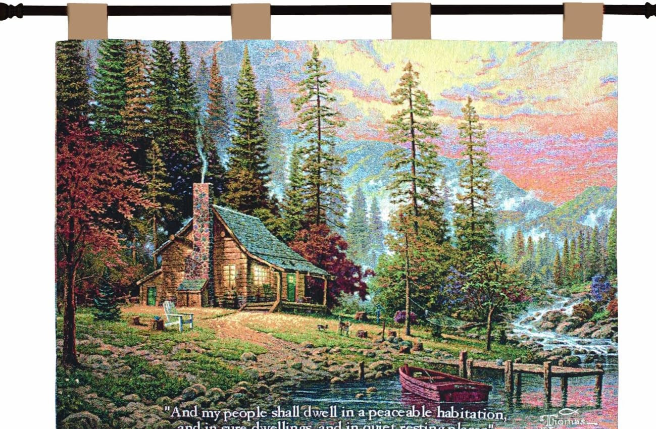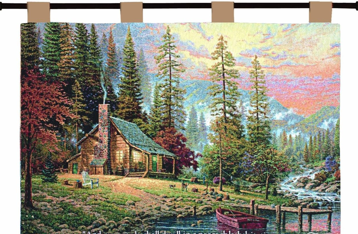 Escape into tranquility with A Peaceful Retreat with Verse, a beautifully crafted wall hanging from Manual Woodworkers. Measuring 36 inches wide by 26 inches long, this cotton woven tapestry features a serene lakeside cabin surrounded by forest scenery, enhanced by an uplifting verse that speaks to the soul. Earthy tones and peaceful imagery make it ideal for rustic homes, lodges, and reading nooks. The included decorative finial rod ensures quick and elegant display. With its blend of natural beauty and comforting words, it brings a quiet, reflective mood to any space.