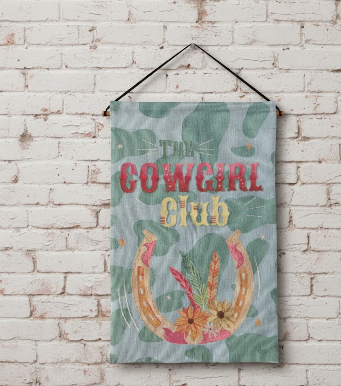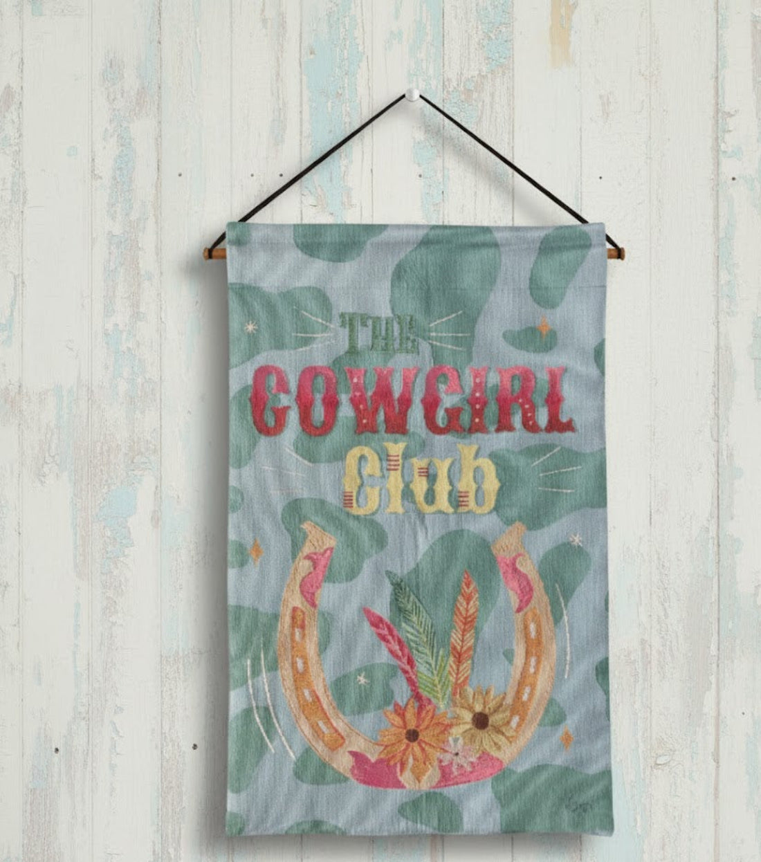 Bring bold western flair to your space with the Cowgirl Club Wall Hanging by Manual Woodworkers. This 17-inch by 25-inch woven tapestry features a spirited cowgirl design bursting with vintage charm and rustic attitude. With vibrant detailing and high-quality cotton weave, it’s the perfect accent for any farmhouse, lodge, or Western-themed room. Finished with a decorative rod and tassels, this piece is ready to hang and makes a striking statement in entryways, bedrooms, or creative studio spaces.