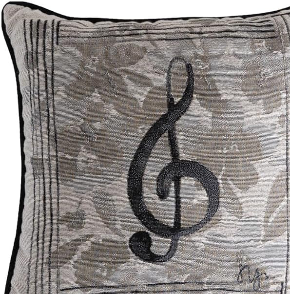 Manual Woodworkers and Weavers Decorative Music Note Throw Pillow, 17" x 17" Woven Cushion with Black Piping in Gray and White