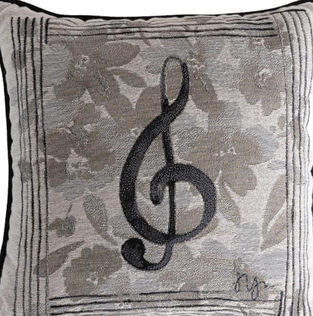 SKU - MWWTLMNWFDecorative Music Note Throw Pillow, 17" x 17" Woven Cushion with Black Piping in Gray and White