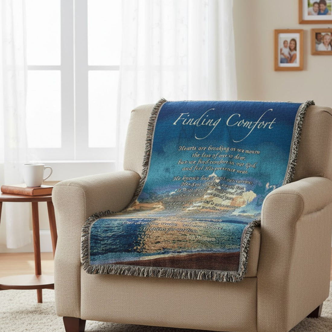 Wrap yourself in solace and serenity with the Finding Comfort Tapestry Throw by Manual Woodworkers. Measuring 50 inches by 60 inches and woven from 100% cotton, this throw features a tranquil nature scene paired with a heartfelt verse that offers spiritual encouragement and peace. Whether placed on a sofa, armchair, or used in a prayer space, this throw combines warmth with emotional resonance—making it a thoughtful gift for loved ones in times of healing, reflection, or remembrance.