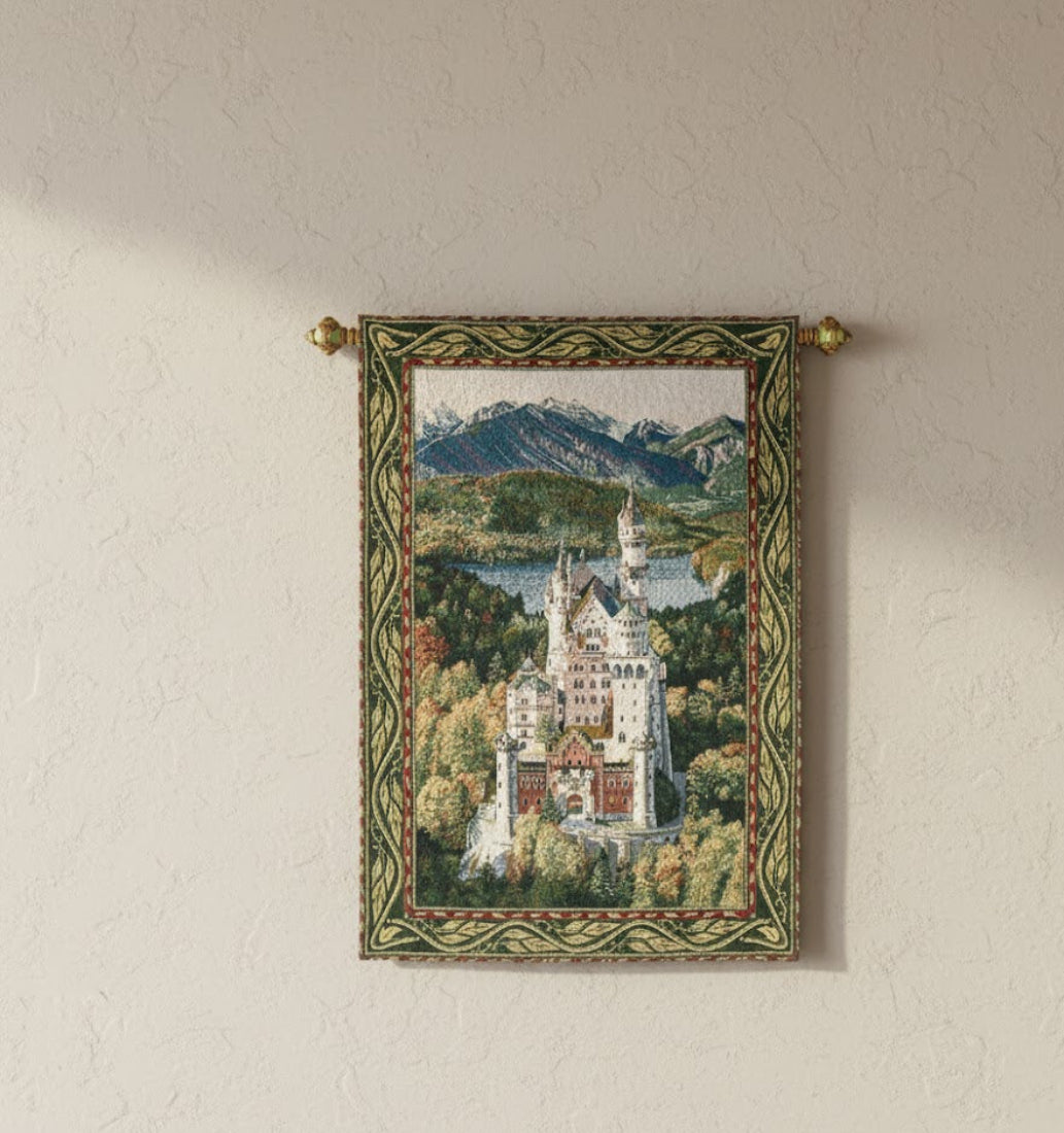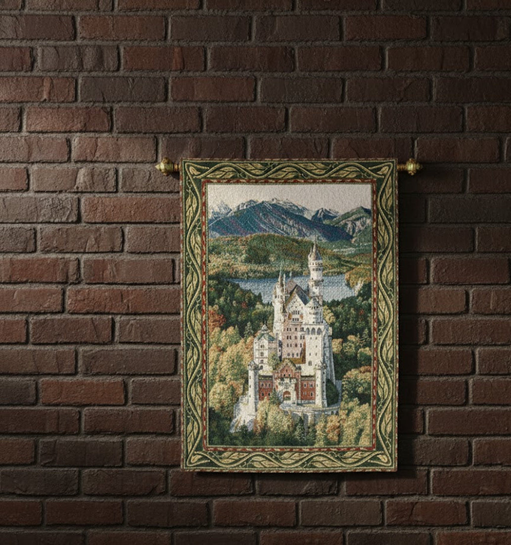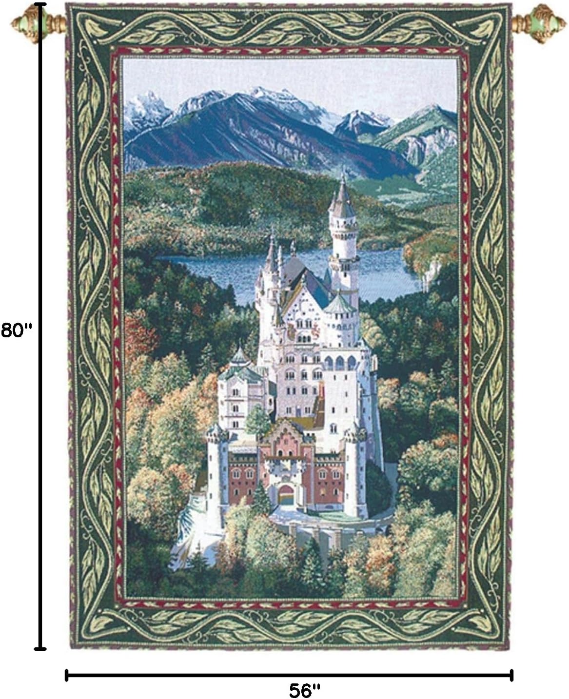 Bring the grandeur of European architecture into your home with the Neuschwanstein Castle Grande Tapestry Wall Hanging by Manual Woodworkers. This breathtaking woven tapestry measures a dramatic 56 inches wide by 80 inches tall, showcasing the iconic Bavarian castle nestled among lush mountains and rolling forests. Richly colored and masterfully crafted from 100% cotton, this piece evokes old-world charm and timeless elegance. Ideal for large spaces such as grand staircases, great rooms, or gallery walls, it includes a rod pocket for seamless display.