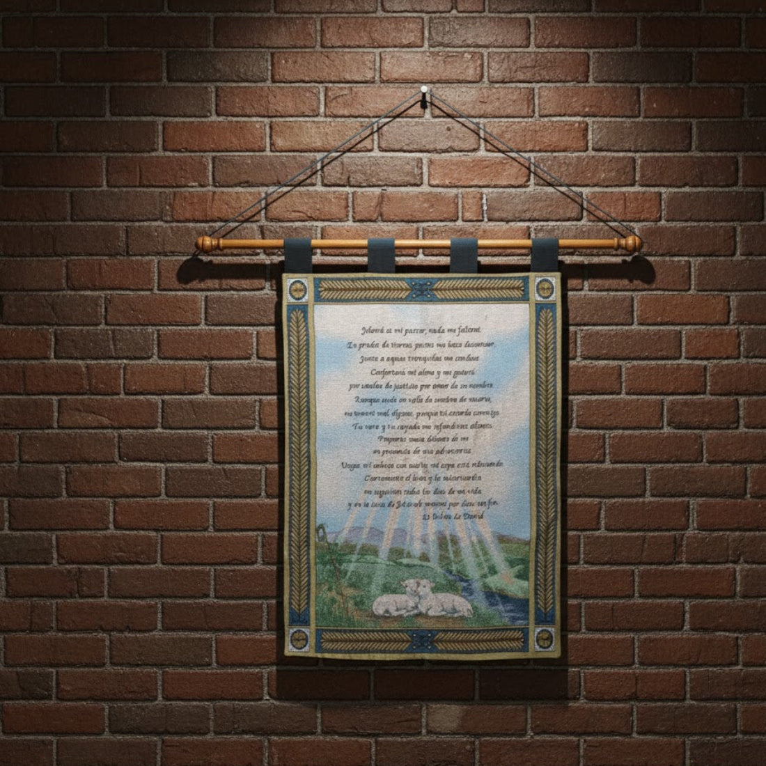 Celebrate faith and heritage with the Psalm Spanish Tapestry Wall Hanging by Manual Woodworkers. This 26-inch wide by 36-inch long textile is skillfully woven in 100% cotton, featuring a beautifully scripted Spanish-language Psalm, framed by elegant decorative borders. The unframed design allows for flexible hanging, whether in a living room, prayer space, or hallway, adding a warm, spiritual element to your interior. The tapestry’s soft texture and cultural richness make it an ideal piece for homes that cherish both tradition and inspiration.