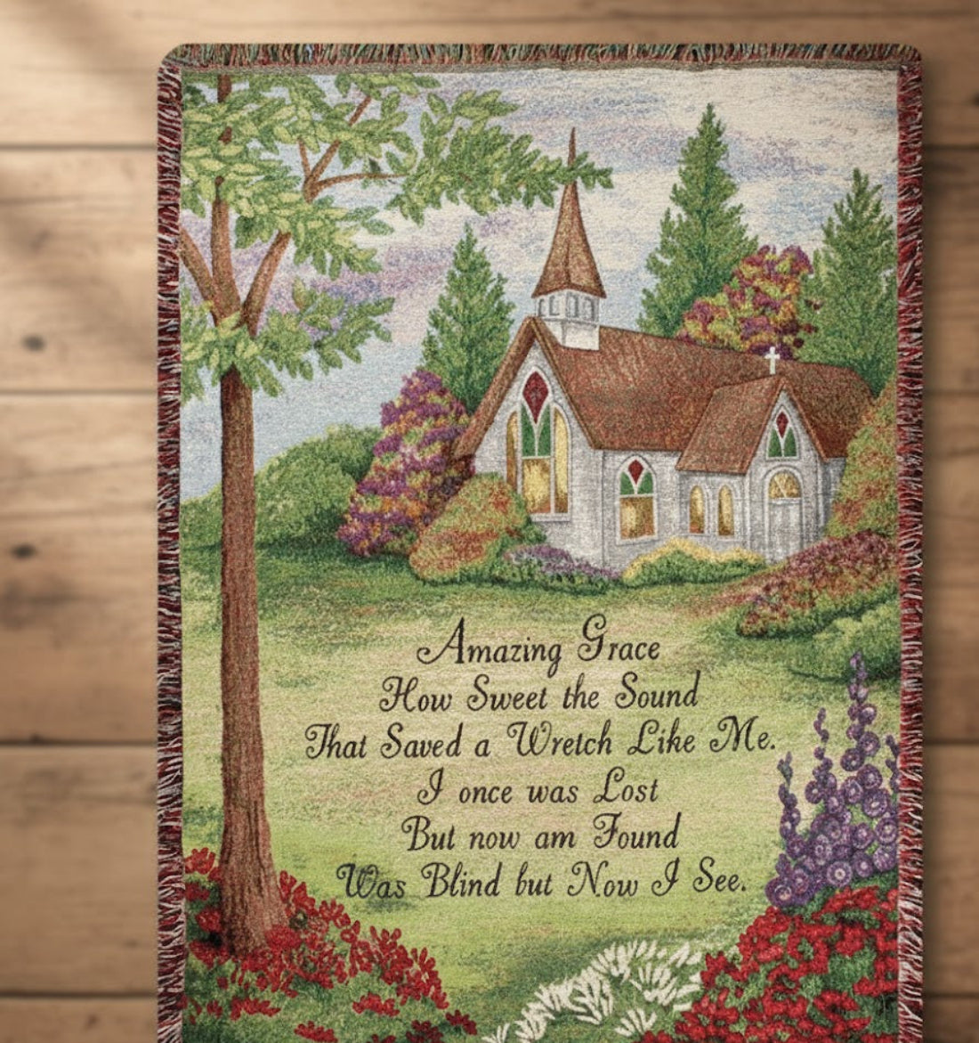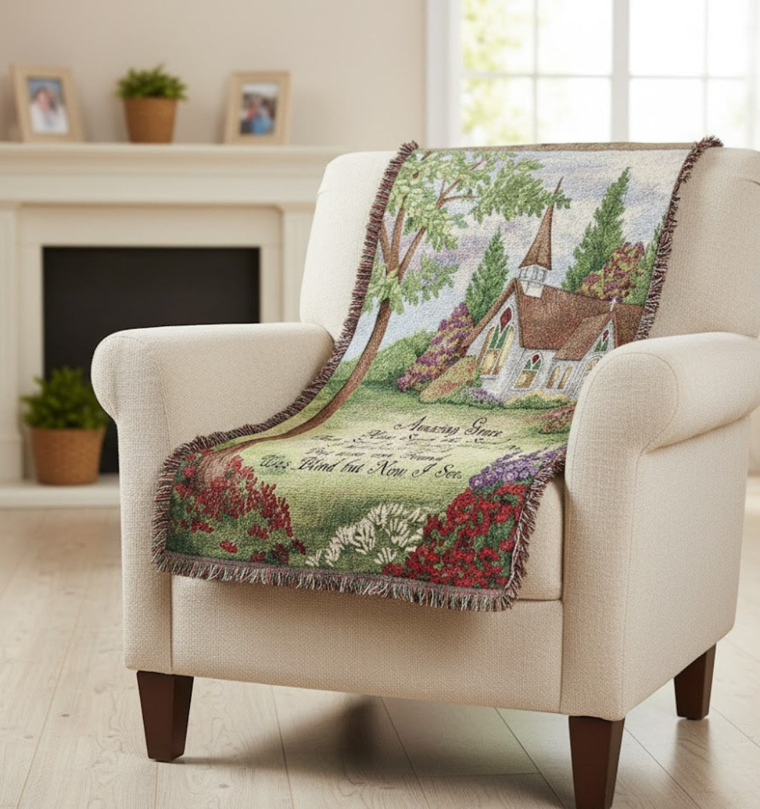 Bring peace and inspiration to your home with the Manual Woodworkers Scenic Amazing Grace Tapestry Throw with Fringe. This 50-inch wide by 60-inch long woven throw blends stunning scenic artwork with the uplifting words of the beloved hymn “Amazing Grace.” Finished with decorative fringe for added charm, it’s a meaningful accent for faith-based homes, prayer spaces, or cozy corners. Whether draped over a chair, laid across a bed, or hung as a wall tapestry, this piece adds spiritual comfort, warmth, and beauty to any setting.