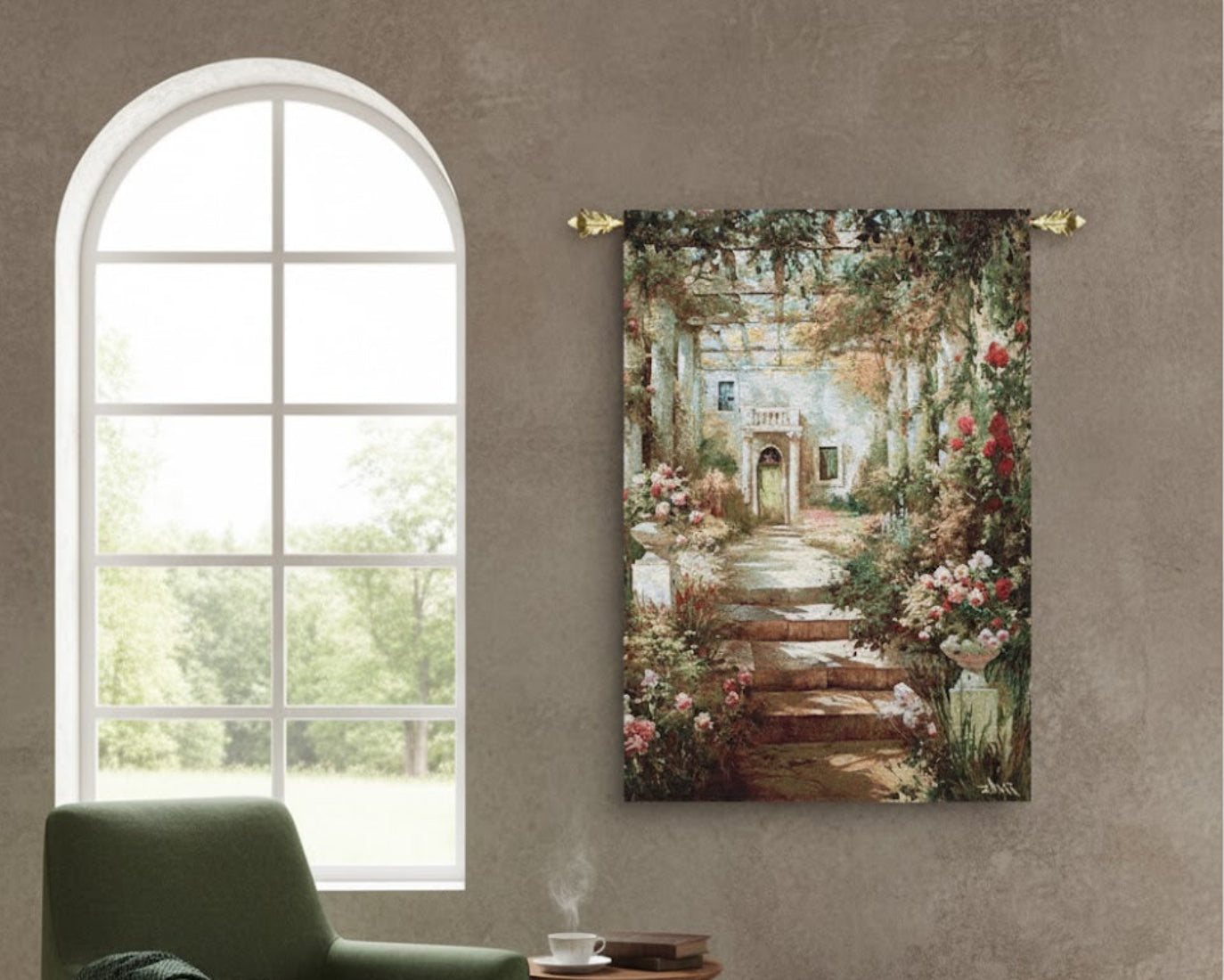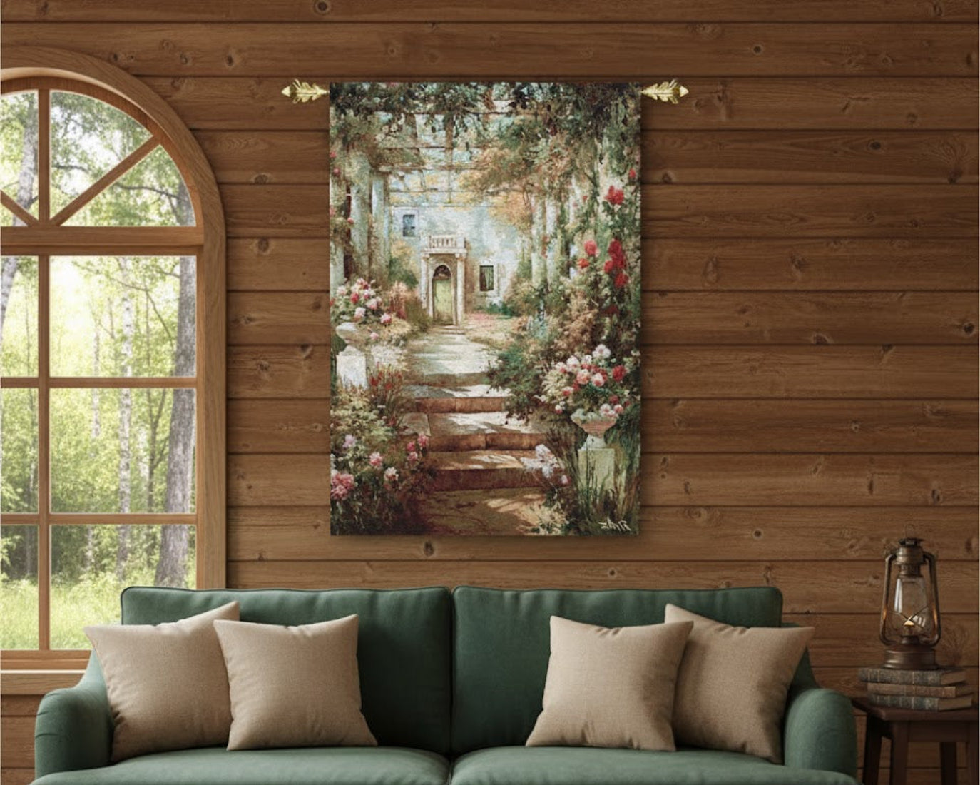 Bring the warmth and tranquility of a sunlit garden into your home with the Summer Pergola Grande Tapestry Wall Hanging by Manual Woodworkers. Measuring 35 inches wide by 47 inches long, this generously sized woven tapestry features a lush pergola scene adorned with vibrant florals, shaded pathways, and blooming vines—evoking the peaceful charm of a summer retreat. Crafted from high-quality cotton yarns, it offers soft texture and visual depth. Designed with a rod pocket for easy hanging, this piece makes an elegant addition to living rooms, dining areas, and sunrooms.