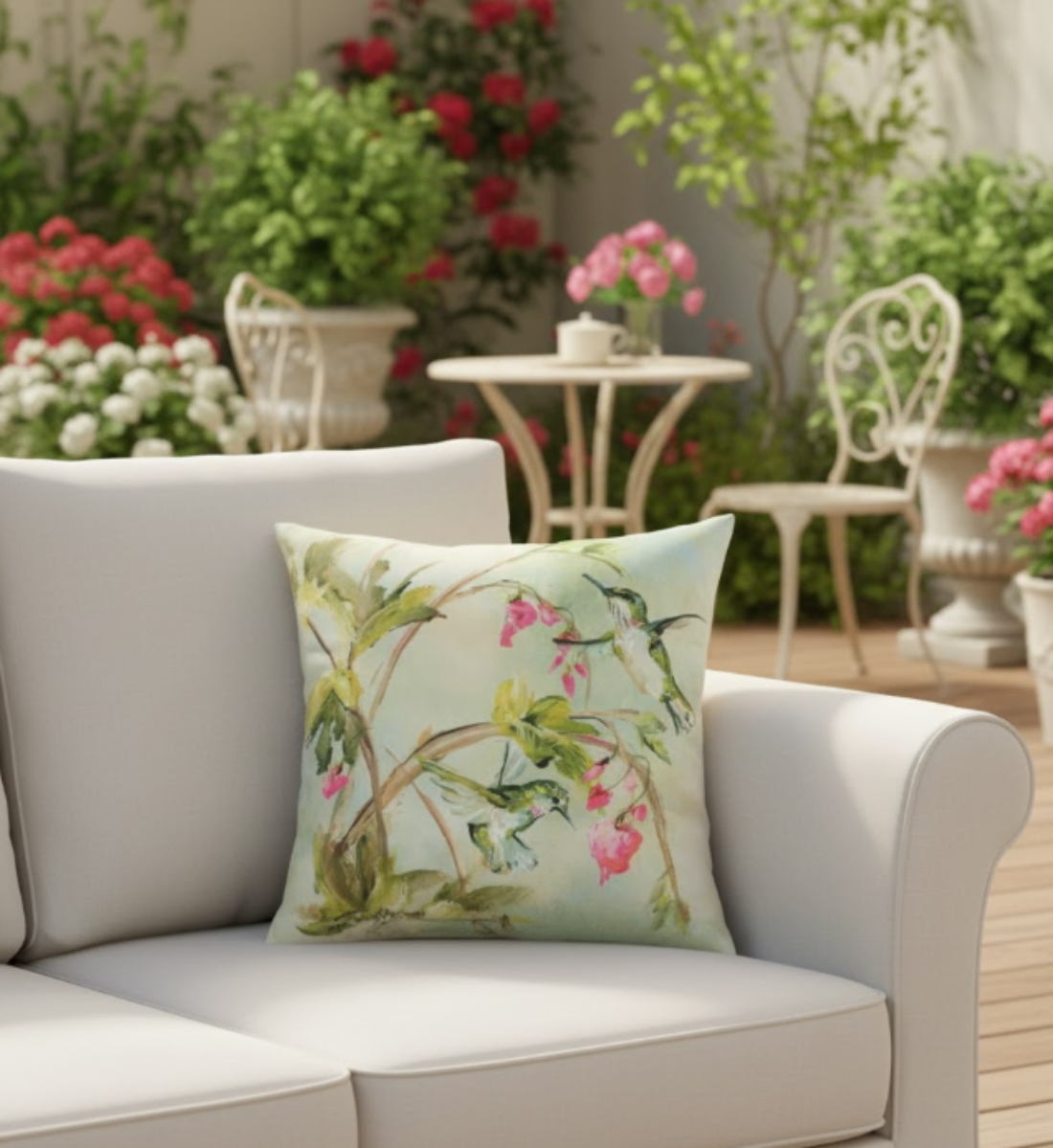 Manual Woodworkers Botanical Pillow – Hummingbirds in Garden Scene, 18-inch Size