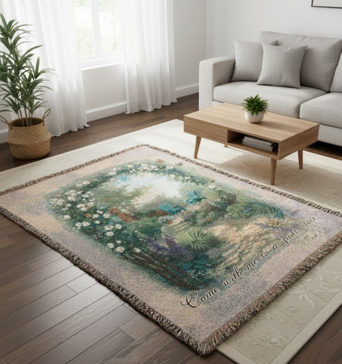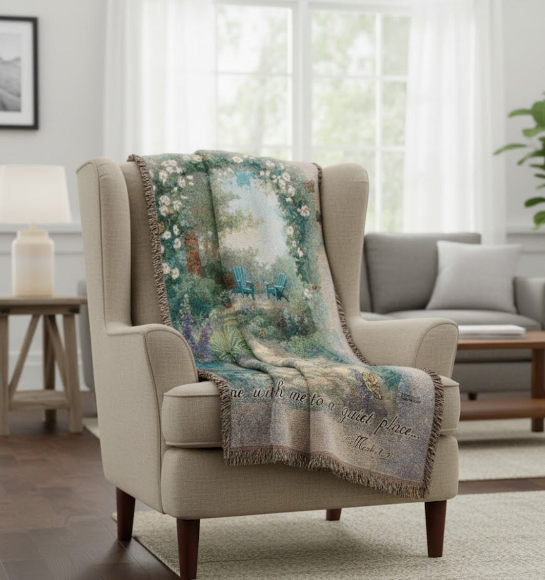 Brighten any space with the peaceful beauty of the Manual Woodworkers Morning Butterfly Tapestry Throw. This 50 × 60-inch throw blanket is crafted from 100% woven cotton and features a delicate butterfly design framed by floral elements and a light, uplifting sentiment. Rendered in soft morning hues—like sky blue, lavender, and warm neutrals—the design evokes the calm of early daylight and the promise of new beginnings. Finished with classic fringe on all sides, the horizontal layout makes it ideal for layering across beds, sofas, or hanging as wall art. It's a cozy and meaningful touch for any room.