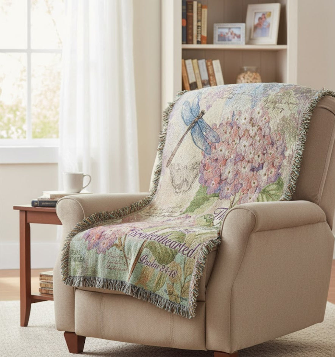Add timeless comfort and spiritual reflection to your home with the MW Field Guide with Verse 50" x 60" Tapestry Throw. Featuring the comforting words of Psalm 34:18 beautifully integrated into a vintage-inspired botanical illustration, this soft woven throw is crafted from a high-quality cotton blend for both warmth and durability. The generous 50" x 60" size makes it ideal for draping over a sofa, reading chair, or end of a bed, offering a cozy layer with uplifting design. Its neutral tones and field guide motif add rustic charm and quiet elegance to traditional, farmhouse, or cottagecore interiors.