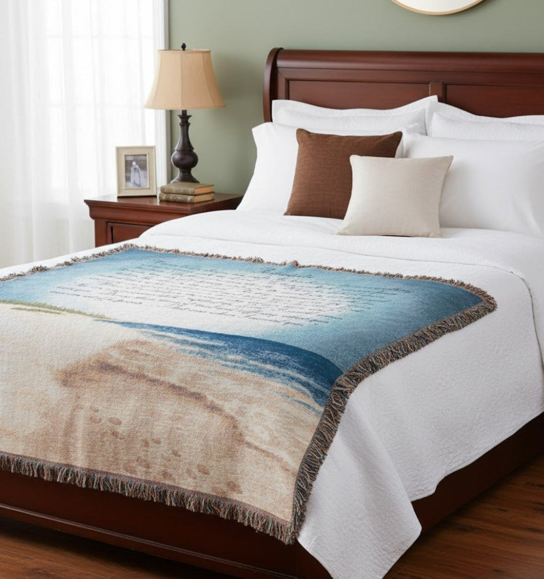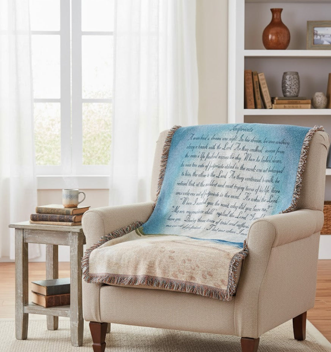 Wrap yourself in comfort and reflection with the MW Inspirational Collection 50" x 60" Tapestry Throw, beautifully featuring the beloved “Footprints in the Sand” poem. Woven from a soft, durable cotton-blend fabric, this throw offers both spiritual encouragement and decorative appeal. The 50-inch by 60-inch size makes it ideal for use as a cozy blanket, a wall tapestry, or a meaningful draped accent over furniture. Designed with soothing earth tones, a serene beach scene, and elegant script, this piece fits seamlessly into traditional, rustic, or devotional spaces. Its horizontal layout and fringed edges add a classic, heartfelt touch—perfect for quiet moments, prayer corners, or as a thoughtful gift.