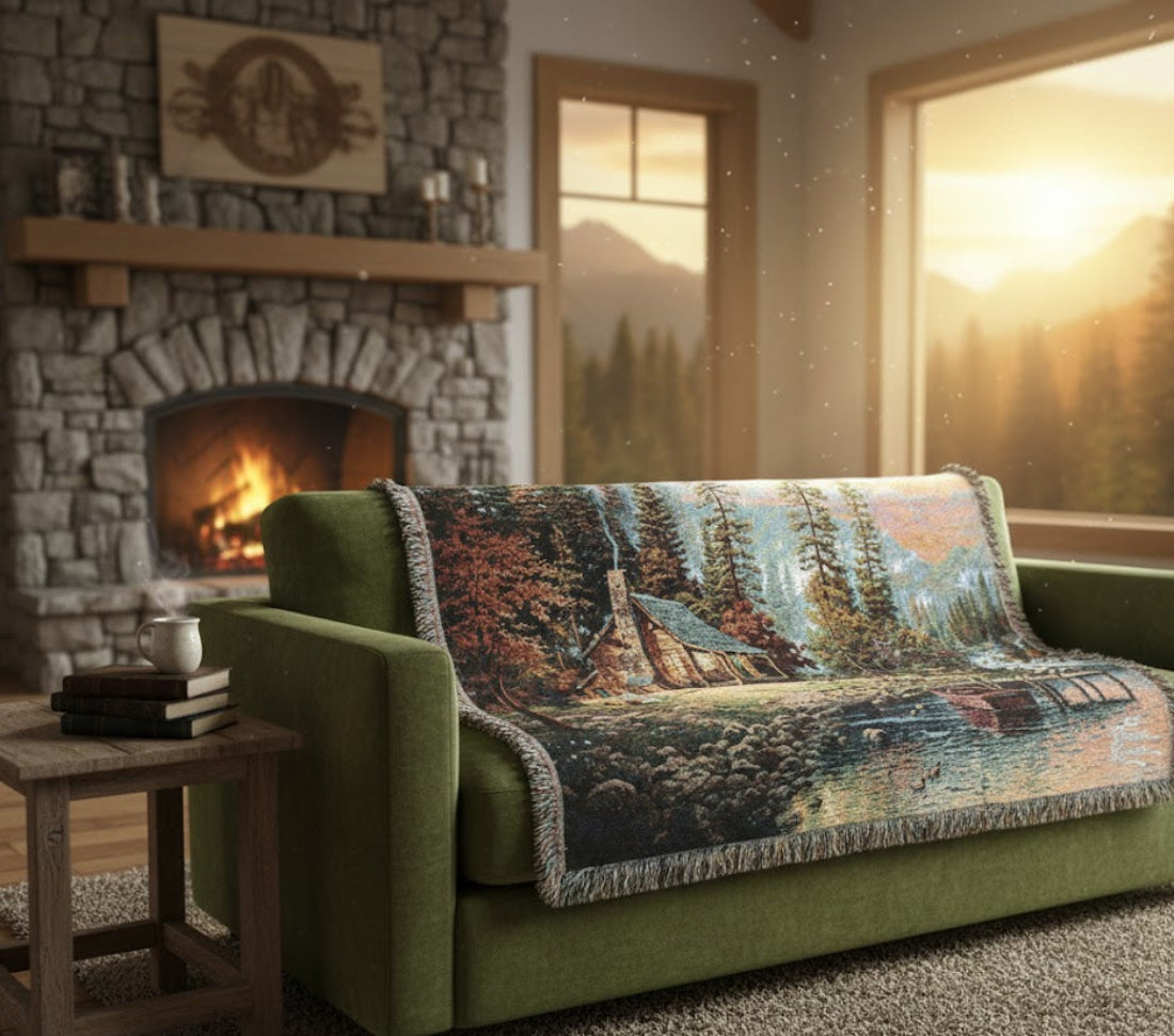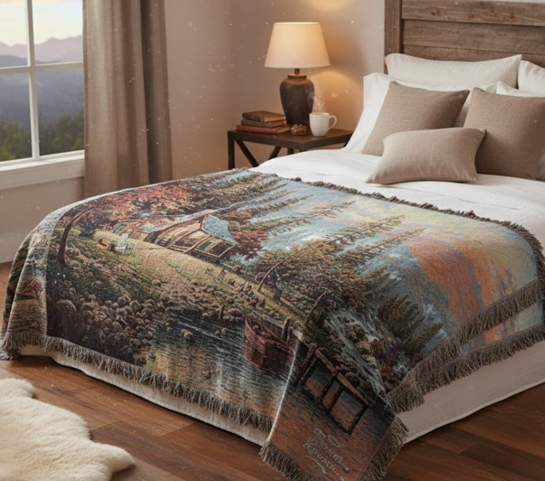 Bring the serenity of Thomas Kinkade’s artistry into your home with the Manual Woodworkers 60 x 50-Inch Tapestry Throw, A Peaceful Retreat. Woven from 100% cotton, this throw captures Kinkade’s iconic painting style with soft light, natural beauty, and inviting detail. Measuring 60 × 50 inches, it’s perfectly sized for draping across a sofa, bed, or chair, while also offering cozy comfort. The fringed edges and rich, vibrant colors make it a beautiful accent piece for any living space. Ideal as both a functional blanket and decorative wall tapestry, this piece embodies tranquility and timeless charm.