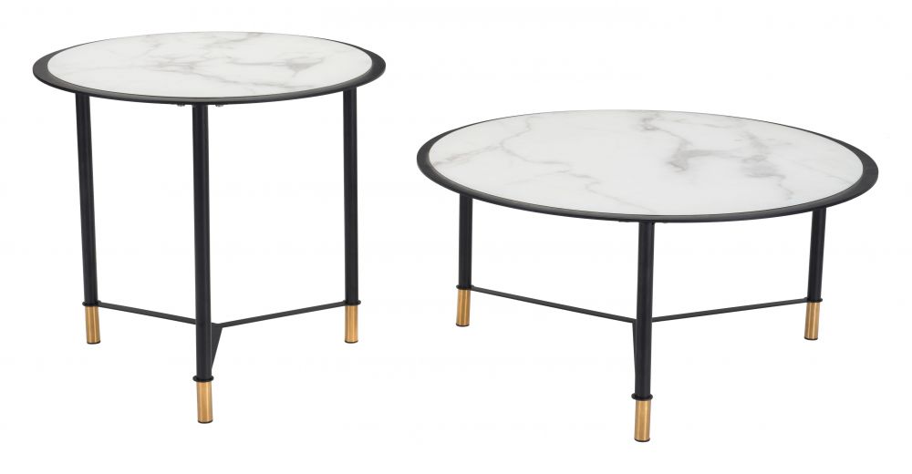 Marble Glass Top Coffee Table 21.9", Set Of 2, White With Black Steel Frame by Zuo Modern