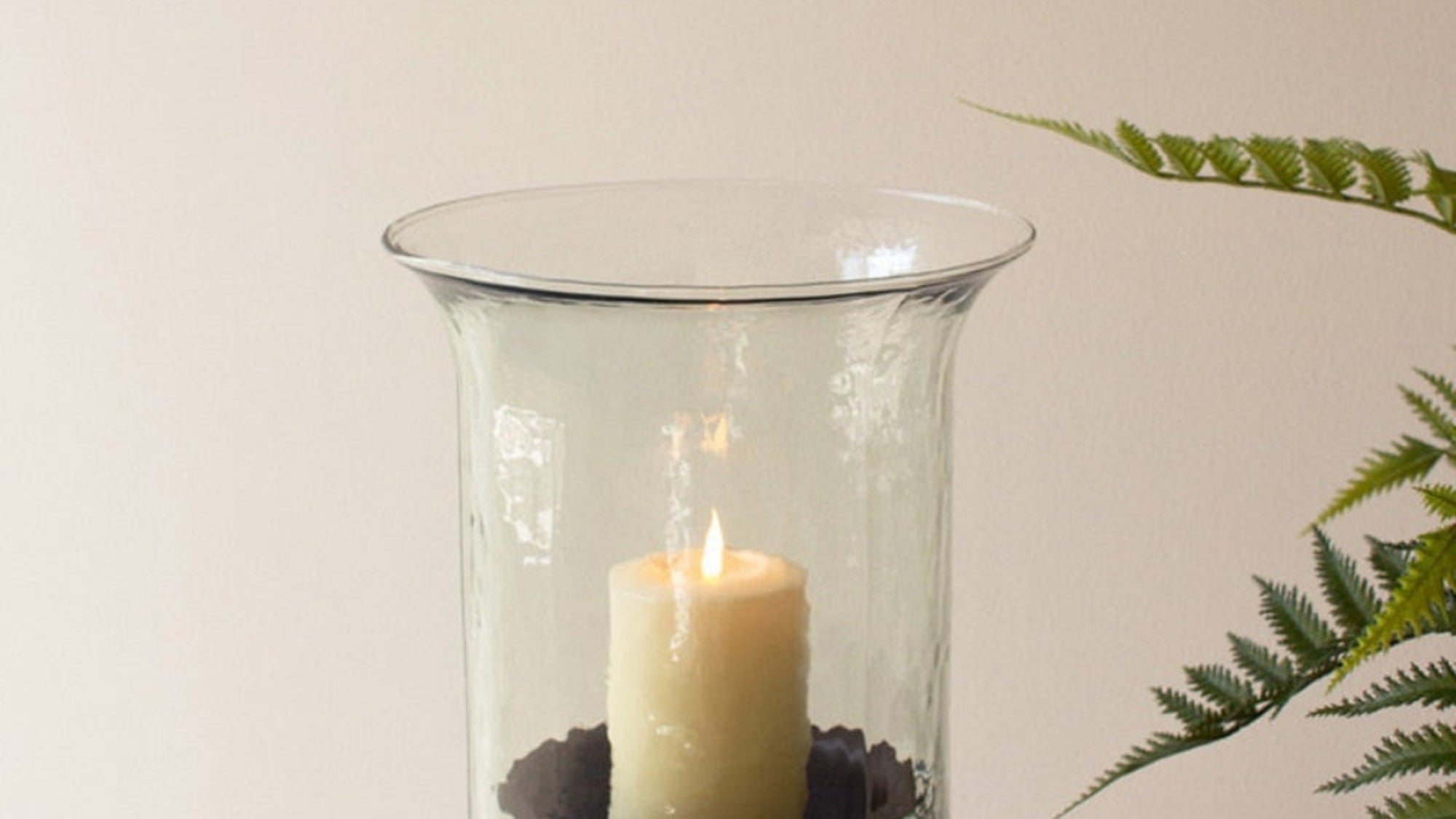 - Hand-blown glass candle cylinder with rustic metal insert