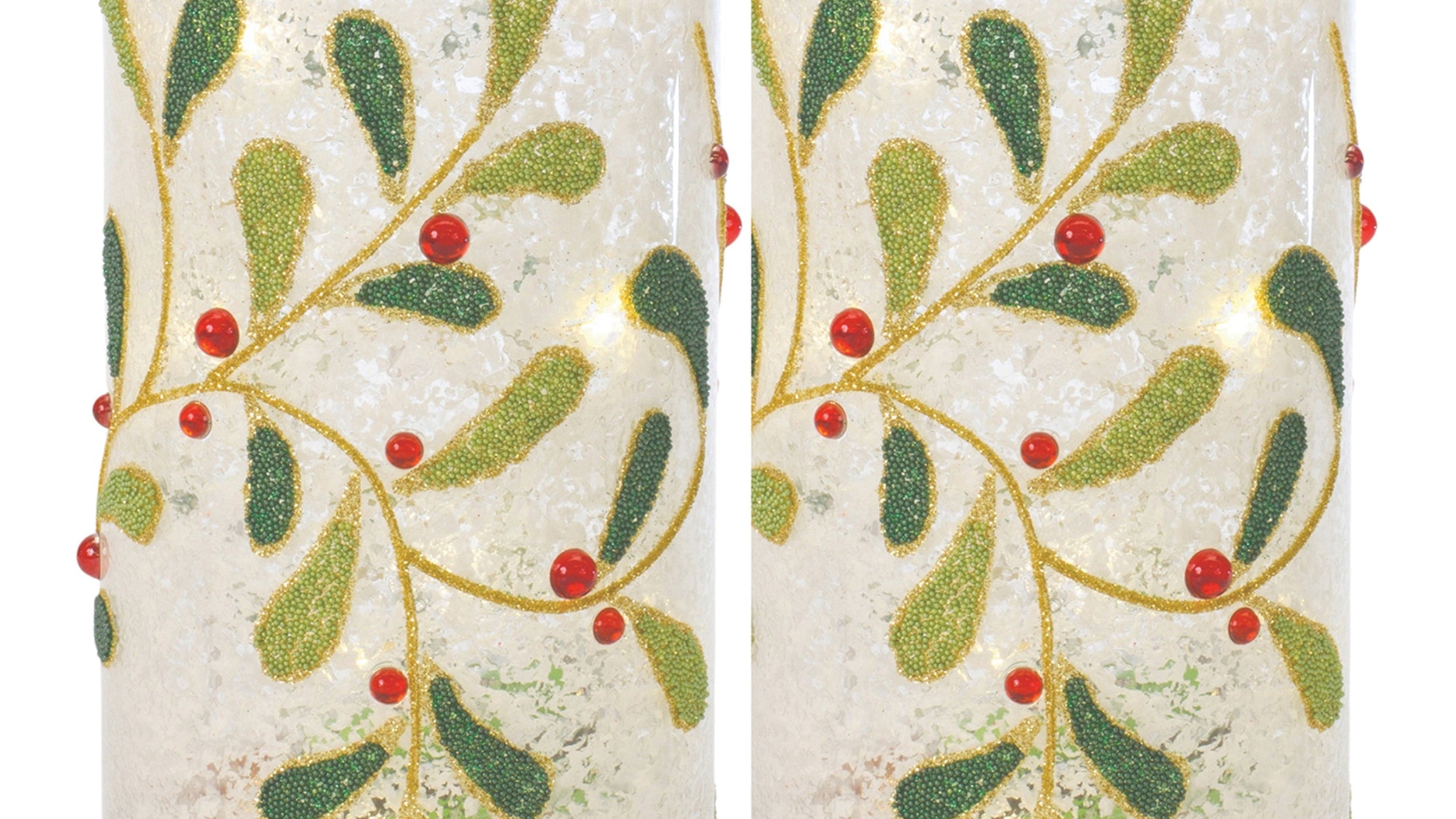Illuminate your home for the holiday season with this beautiful set of Glass Mistletoe Candle Holders. Featuring two pieces, this set is a great fit for your whimsical or traditional style of holiday decor. The frosted glass composition paired with the beaded mistletoe design and berry accents is the perfect combination to create a memorable display. The quality glass composition is sure to ensure for seasons to come. Illumiante the set by adding a real wax or LED candle to each holder. Candles sold separately, the set best fits a 3" pillar candle.