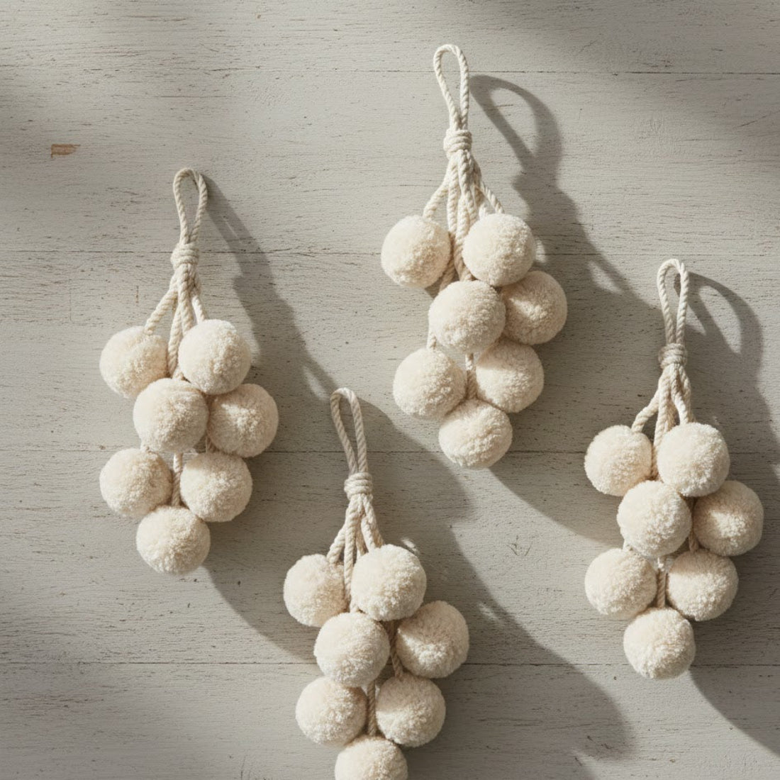 Add a modern touch to your Christmas tree with this stunning set of Pom Pom Cluster Ornaments. Featuring four pieces, the trendy beige tones paired with the fluffy pom pom design are the perfect combination to create a memorable display. The quality polyester composition with rope hanger is sure to endure for seasons to come. Whether you're adding a touch of cheer to your home or gifting to a loved one, these ornaments will definitely bring holiday spirit to your home.