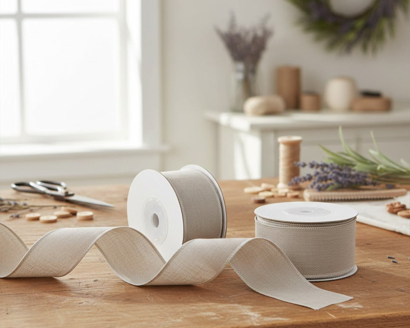 - Wired edges for shaping bows, garlands, and wreaths