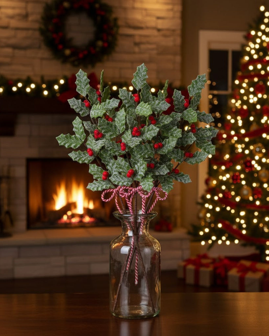 Add a touch of nature to your home with this stunning set of Fabric Holly Berry Sprays. The festive red and green tones paired with the berry and bow accents are the perfect combination to create a memorable display. Display the sprays in a tabletop vase to add height to your decor, or place them into a porch pot to accent the arrangement. Whether you're adding a touch of cheer to your home or gifting to a loved one, these pieces will definitely bring smiles to your home.