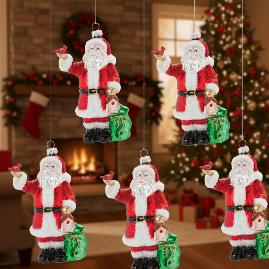 - Set of 6 glass Santa ornaments with cardinal bird design