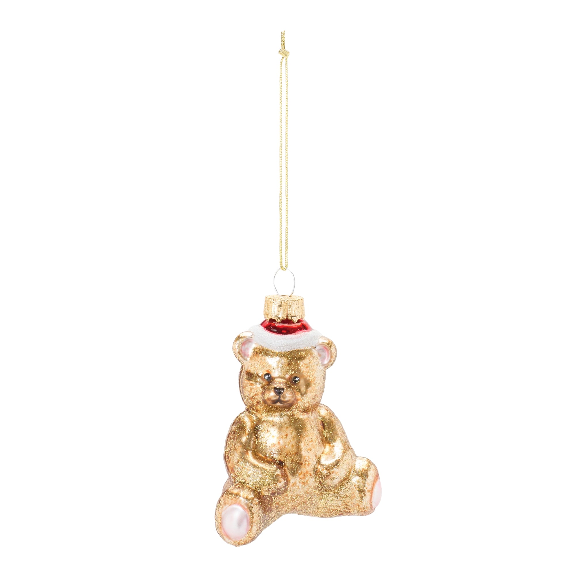 Add a whimsical touch to your Christmas Tree with this beautiful set of Glass Teddy Bear Ornaments. Featuring 12 pieces, this set's chic gold tones, whimsical teddy bear design, and glittered finish with cozy Santa hat accents are the perfect combination to create a memorable display. The quality glass composition with delicate gold string hanger is sure to endure for seasons to come. Whether you're adding a touch of cheer to your home or gifting to a loved one, these ornaments will definitely bring smiles to your home.