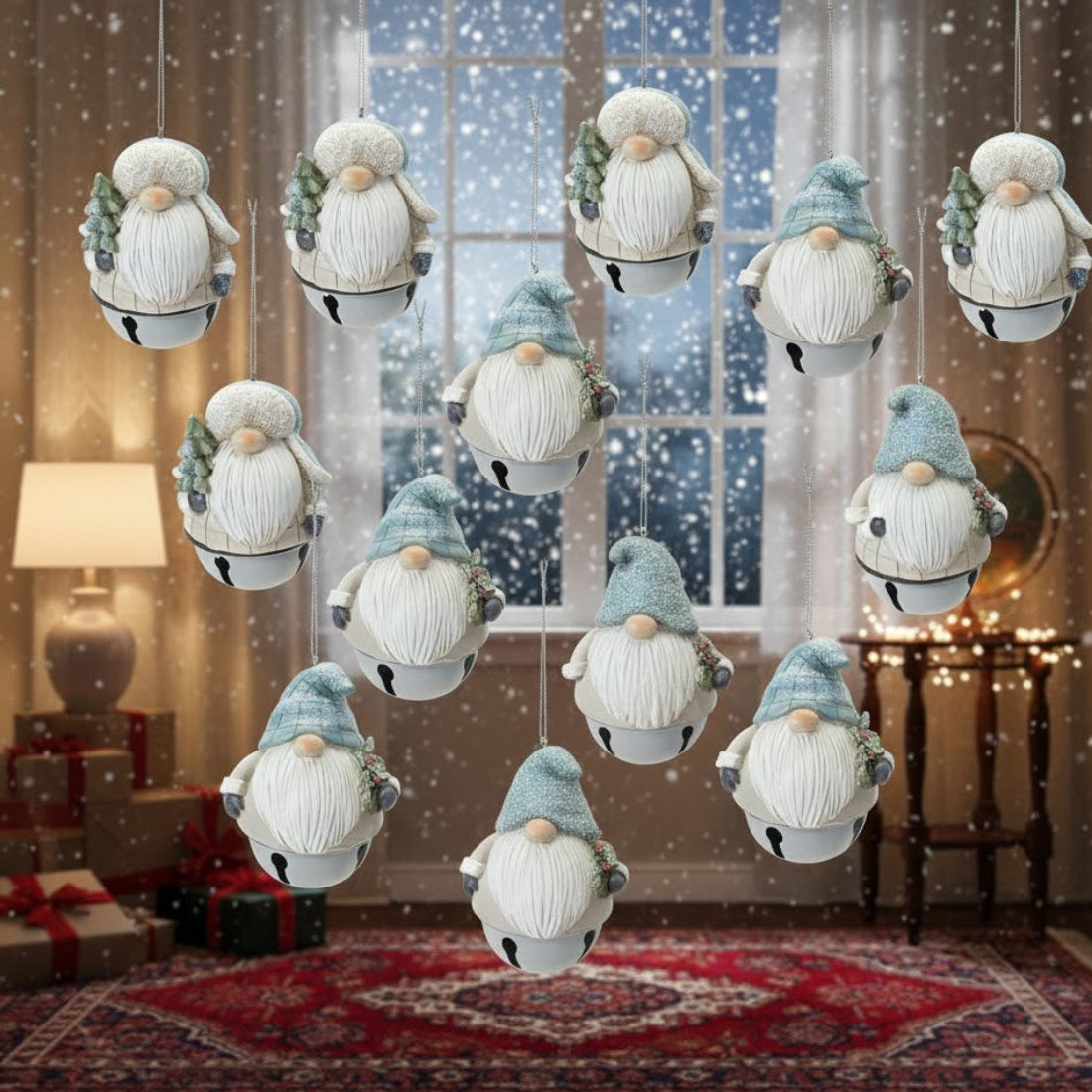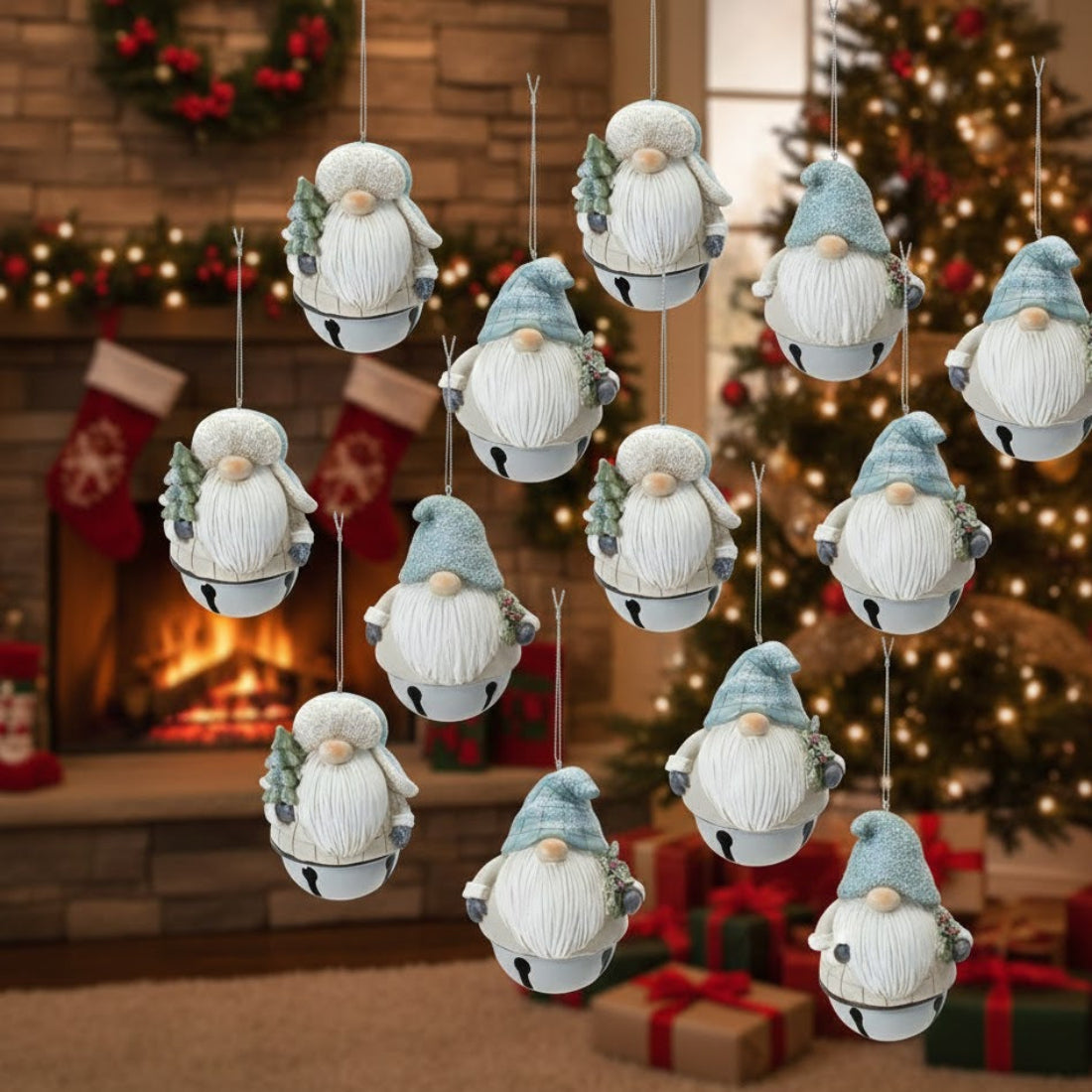 - Set of 12 hanging ornaments in two assorted gnome and bell designs