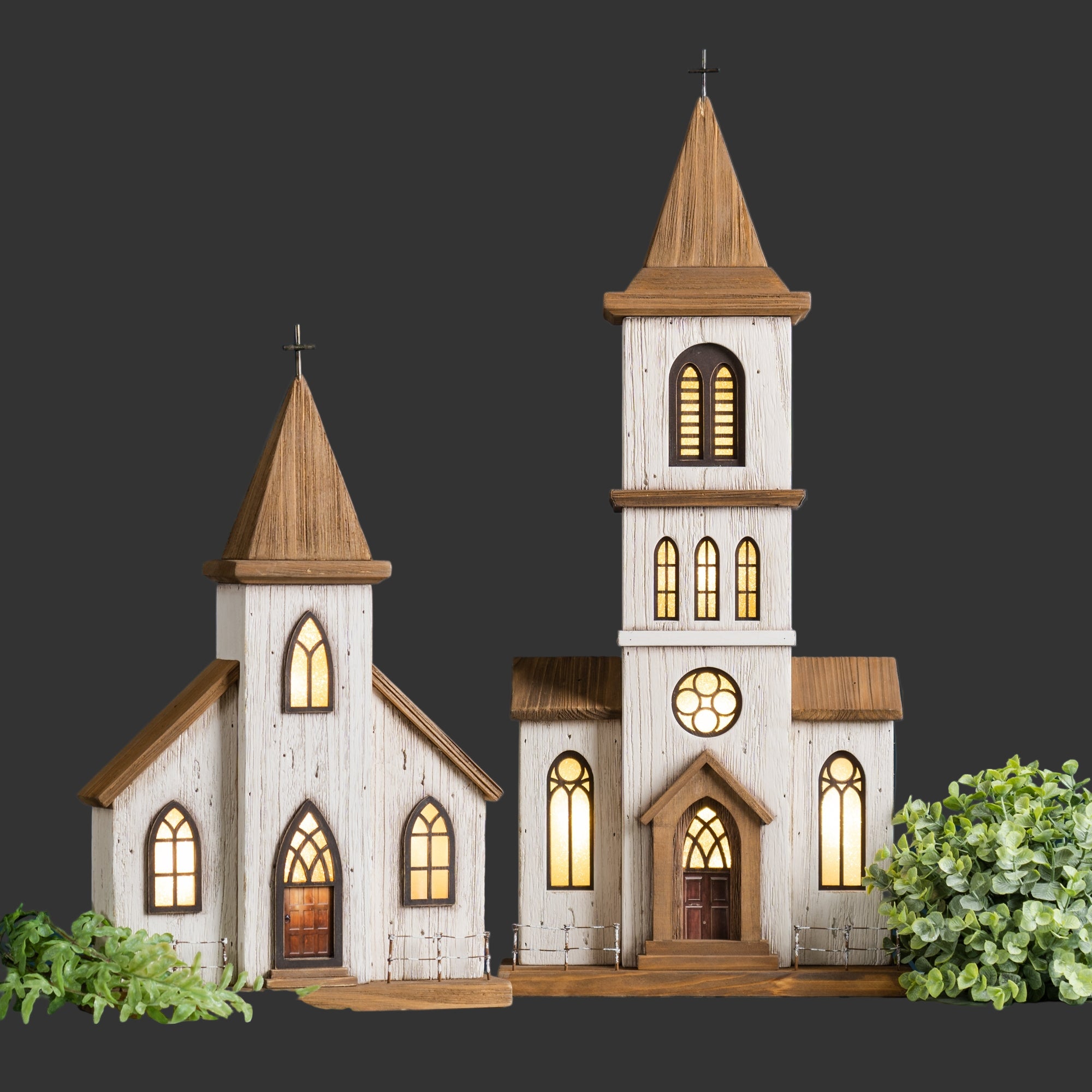 Bring warmth and charm to your home with this beautifully crafted Lighted Wooden Church Display by Melrose. Standing at 17.75"H, this elegant decorative accent is made from natural Paulownia wood and detailed with rustic iron window accents, giving it the nostalgic character of a peaceful country chapel. Its soft interior illumination—powered by the included UL/USB plug—adds a gentle glow that enhances mantels, shelves, consoles, or entryway displays. Perfect for farmhouse, cottage, and rustic-inspired decor, this versatile piece works beautifully for both seasonal styling and year-round ambiance.