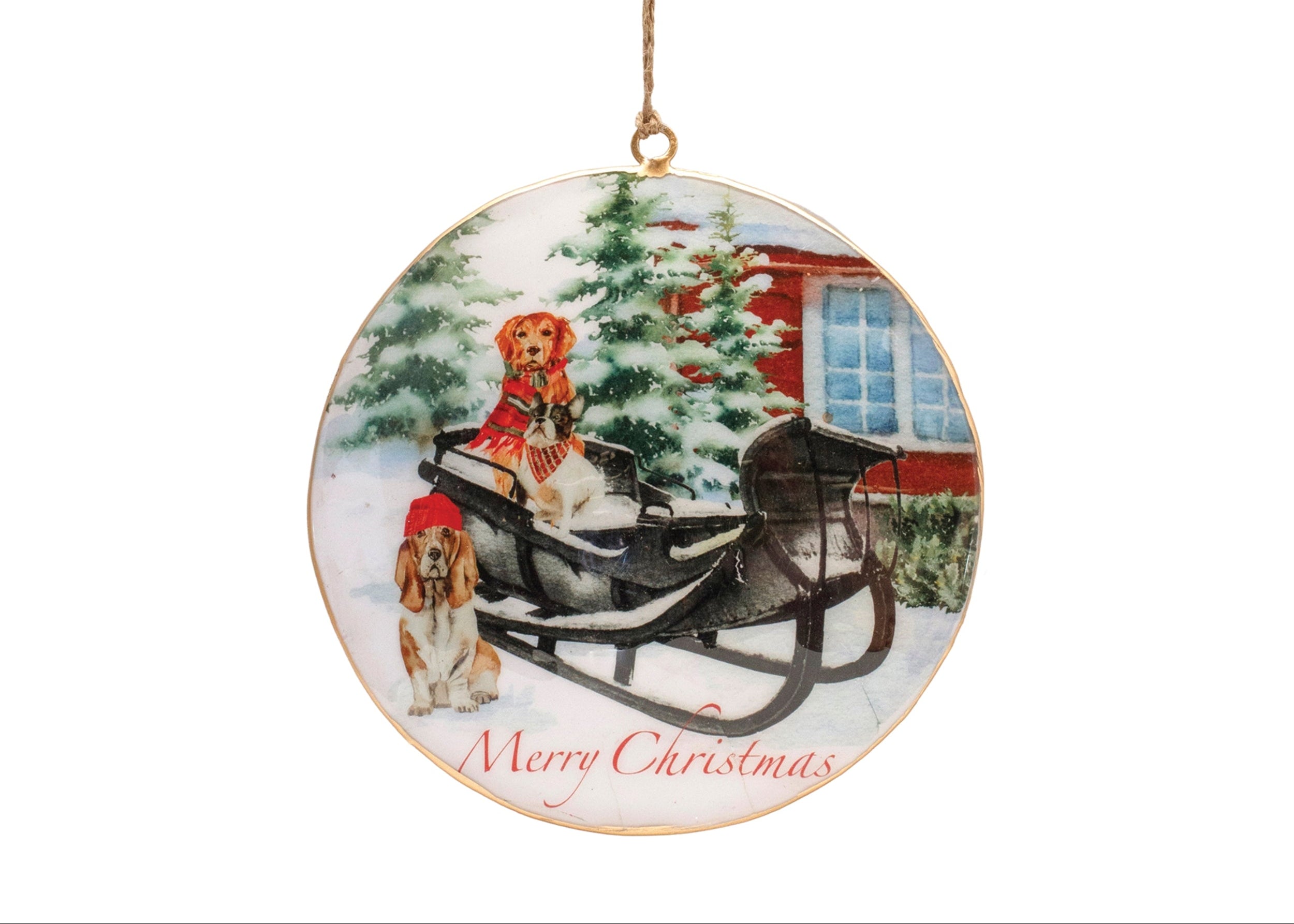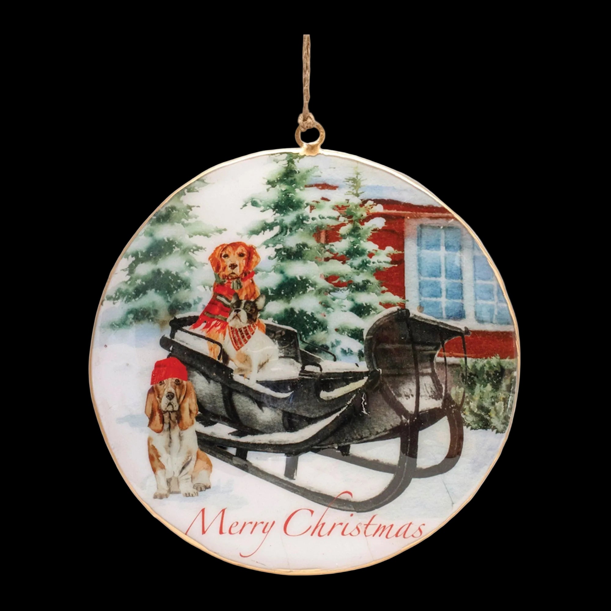 Dog and Sleigh Disc Ornament 6 Inch Iron Metal Vintage Holiday Christmas Tree Decor by Melrose