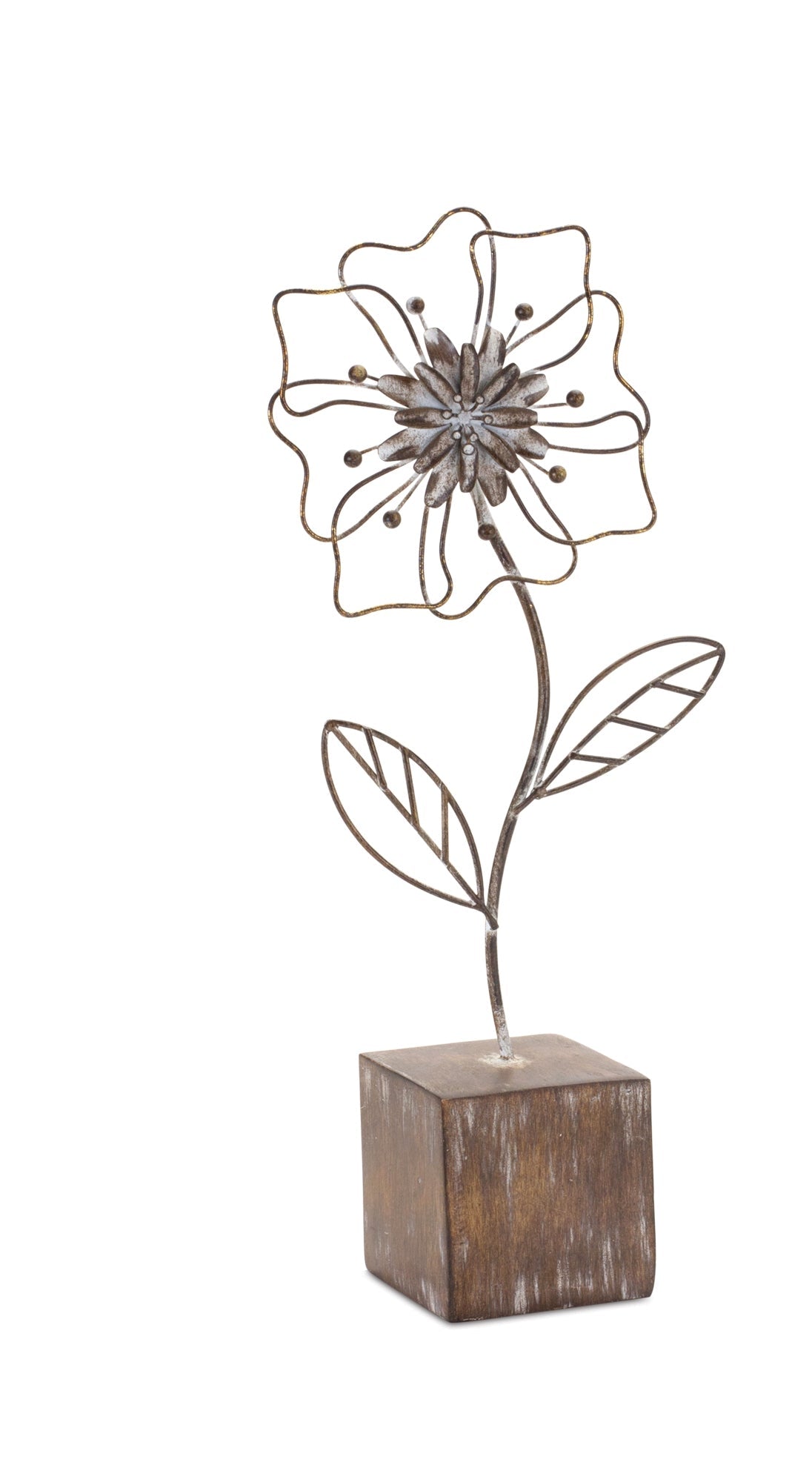This floral tabletop decor set features two rustic metal flower designs mounted on whitewashed resin bases for a balanced and timeless look. Designed for indoor use, each piece blends warm brown metal with distressed white tones that suit farmhouse, vintage, and transitional interiors. The varying heights add visual interest when displayed together on shelves, mantels, console tables, or entryways. Crafted from durable metal and resin, this set offers lasting structure and decorative appeal. Dimensions include one piece measuring 6 inches wide by 3 inches deep by 14.25 inches high and a second piece measuring 3.75 inches wide by 3 inches deep by 14.5 inches high.