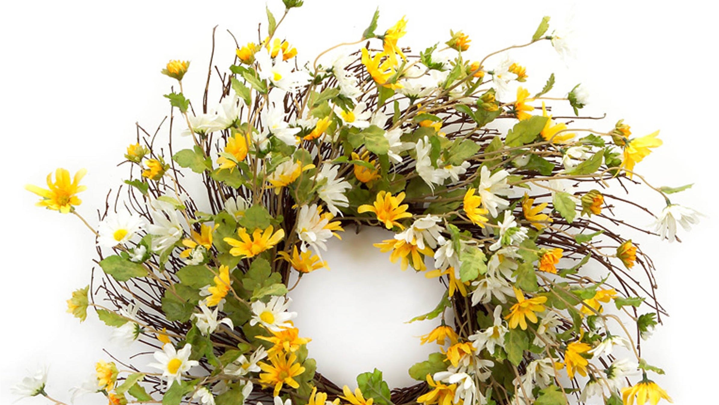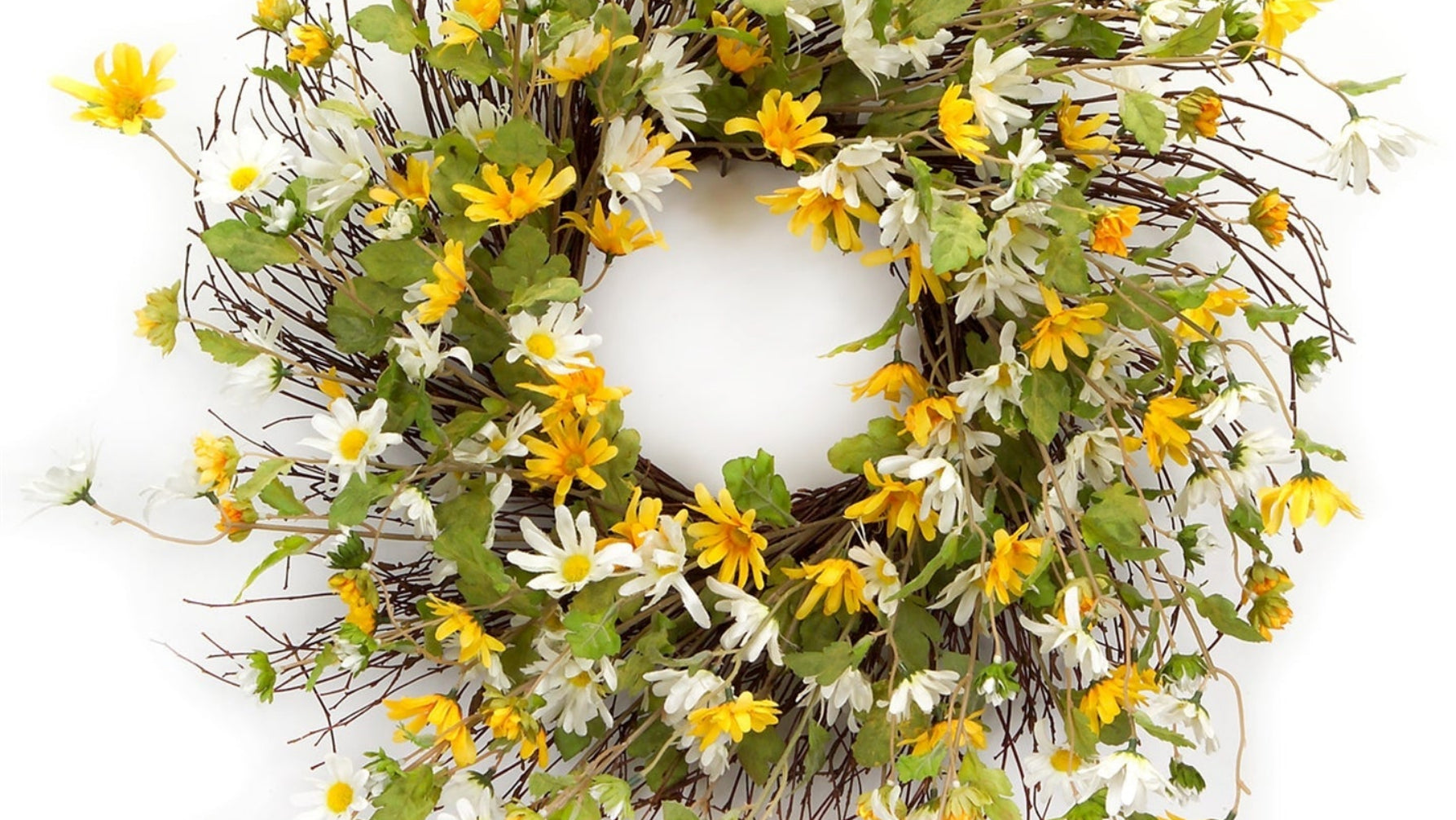 Welcome the beauty of spring into your home with this 24"D Mixed Daisy Floral Wreath. Crafted from durable polyester, this wreath features bright yellow and classic white daisies intertwined with lush green foliage on a natural twig base. Designed for both indoor and covered outdoor use, it brings a fresh and cheerful touch to front doors, entryways, walls, or mantels. The 6" depth adds dimension, while the high-quality materials ensure long-lasting beauty. Perfect for seasonal decor, this wreath enhances any space with vibrant spring charm and versatility. Measures 24 inches across when branches are extended and fluffed.
