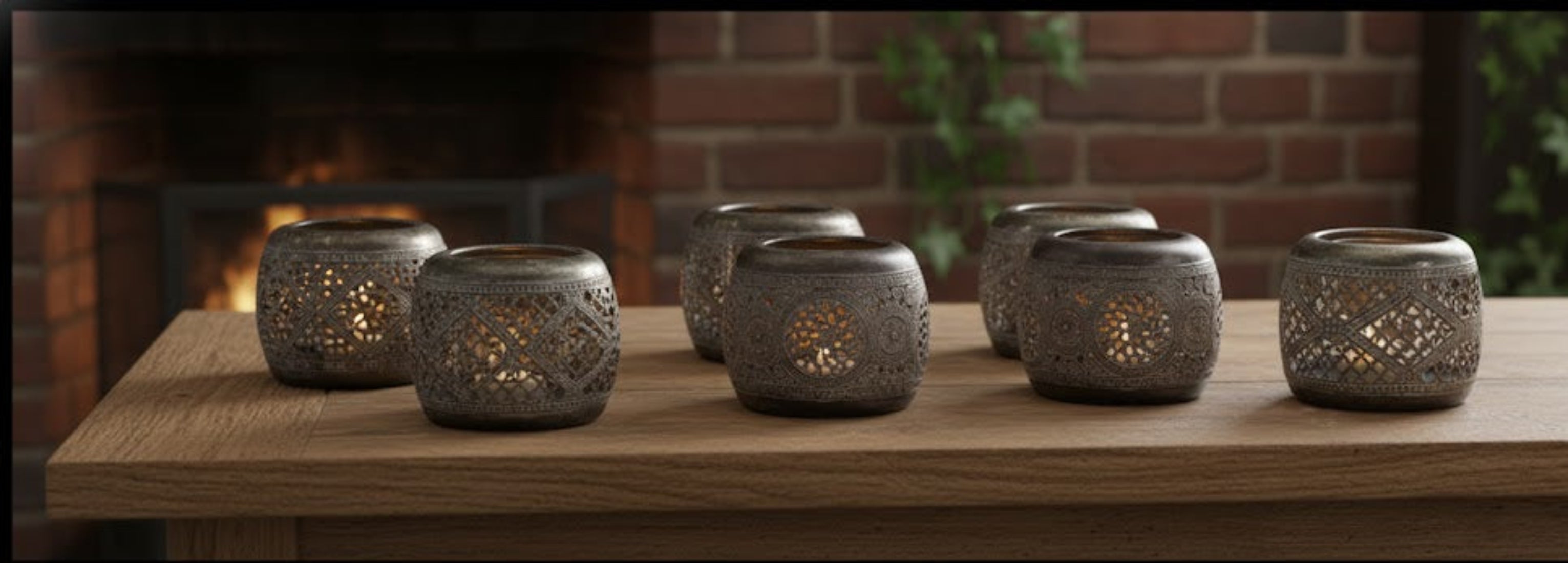 Crafted from durable metal in elegant silver and bronze finishes, these votive holders add a touch of sophistication to living rooms, dining tables, patios, meditation corners, or seasonal displays.