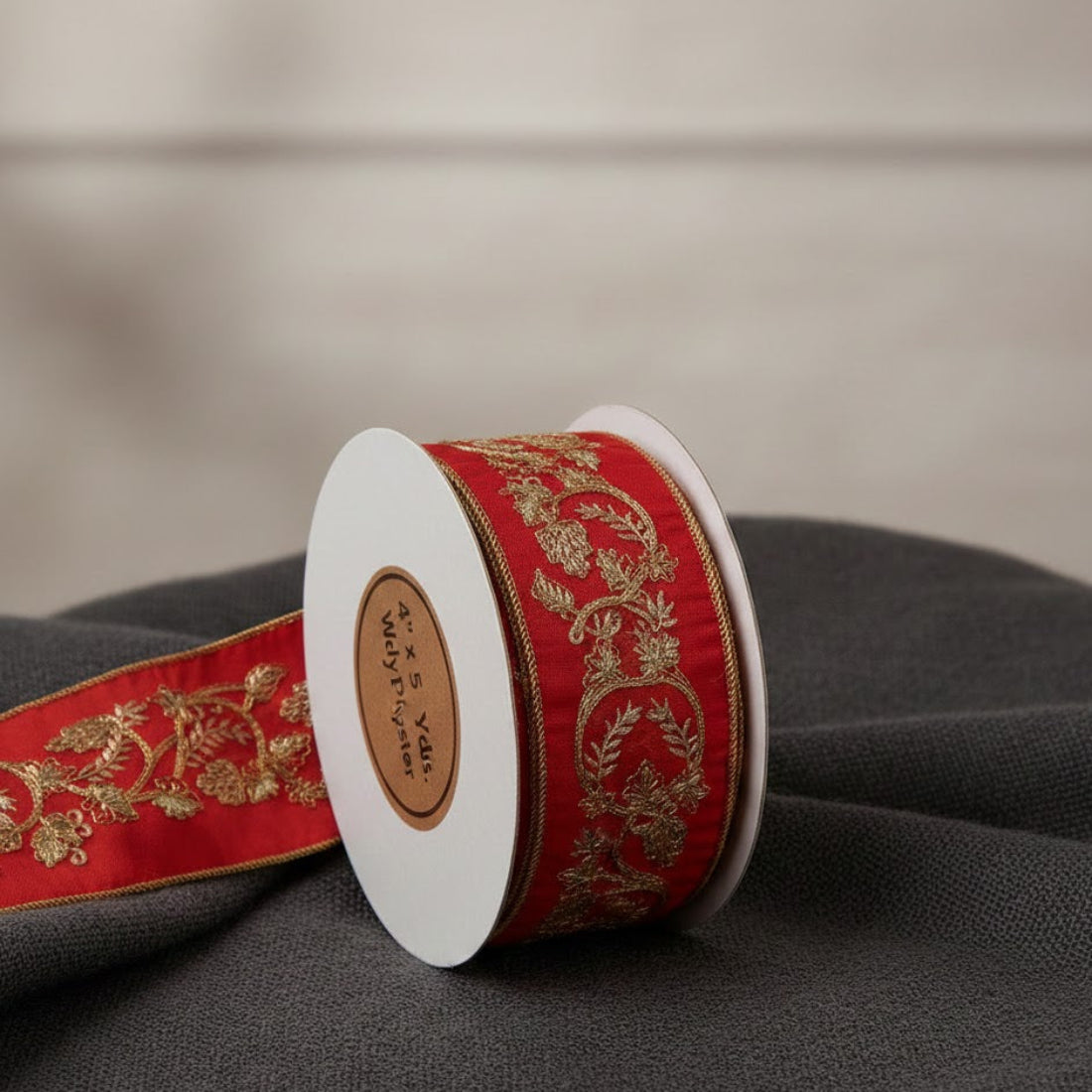 Embellish your home decor items, gift wrap, craft projects, and more with this beautiful Wired Holiday Ribbon. Measuring 4"x5 yards in length, the festive red and gold tones in a ornate winter floral pattern paired with quality polyester and iron wire composition is perfect to create a stunning holiday display. Use this ribbon to make hand-tied bows to adorn onto your Christmas presents or holiday wreaths, or embellish your Christmas tree with a trailing ribbon garland.
