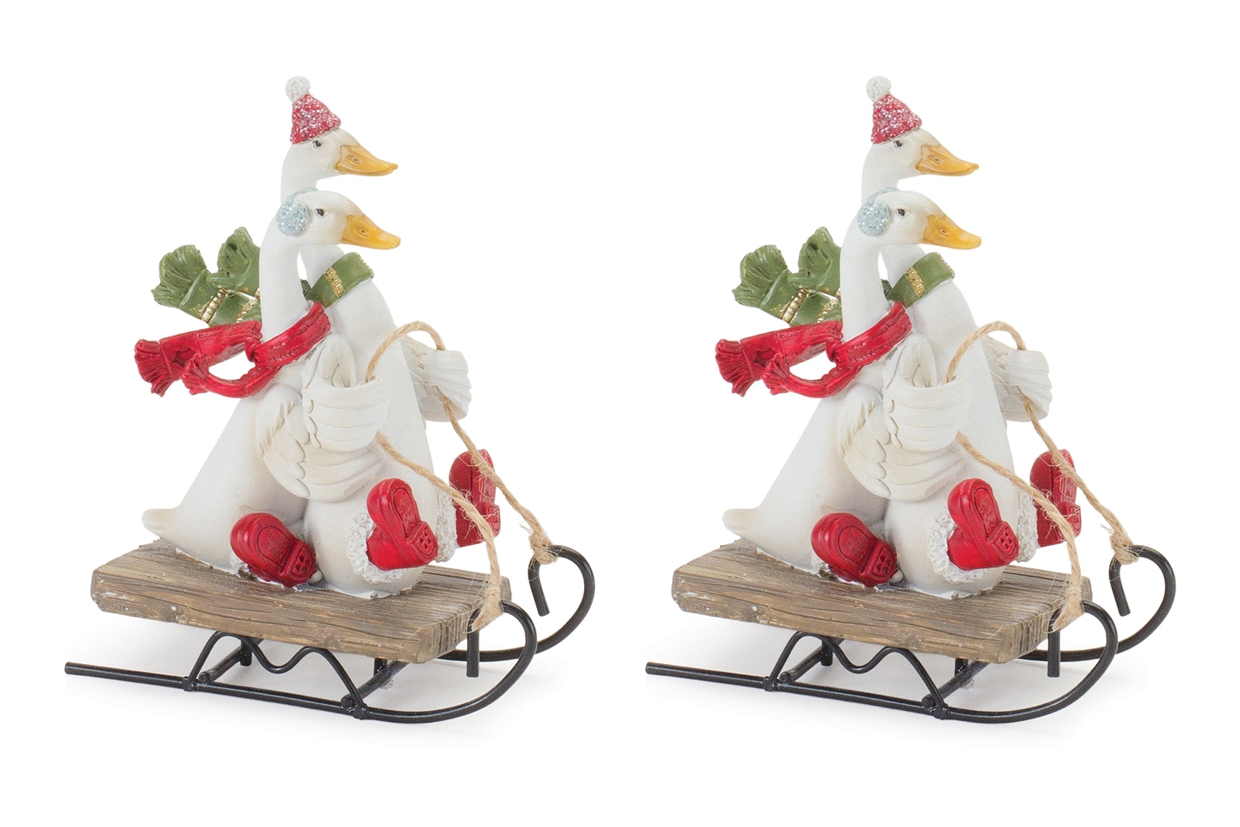 Add playful farmhouse charm to your seasonal decor with this delightful Geese on Sled Figurine Set of 4, crafted from durable resin and stone powder and measuring 5.25 inches in height, 4.25 inches in length, and 2 inches in width. Each goose features a festive vintage sled design with bright red, green, and white accents, along with adorable scarves and boots that bring a cozy winter personality to your space. The sculpted feather details and textured paint finish give these figurines a handcrafted look, perfect for mantels, shelves, tabletops, or holiday centerpieces. This charming set creates a cheerful, storybook-style holiday display in any indoor setting.