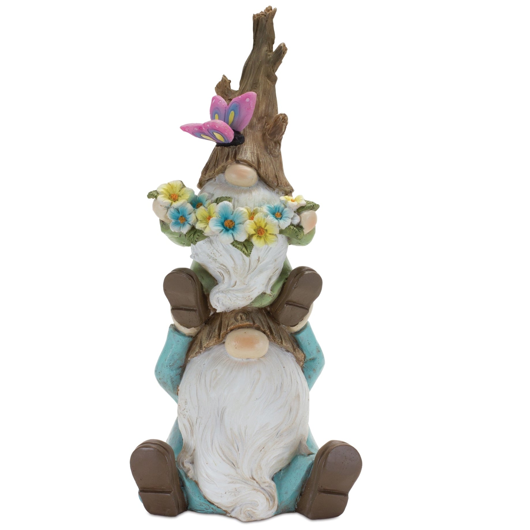 Add a magical woodland touch to your home with the Tree Trunk Gnome Stack Set by Melrose. This delightful pair of gnome figurines features charming tree trunk–inspired hats adorned with floral and butterfly details, bringing a whimsical, nature-loving personality to any space. Crafted from durable resin, these gnomes offer rustic character and playful charm while remaining lightweight and easy to display. Perfect for shelves, entry tables, mantels, or covered outdoor areas, this matching set creates a warm, enchanting decorative moment in your home. Whether styled together or placed separately, they bring joy and whimsy to any room.