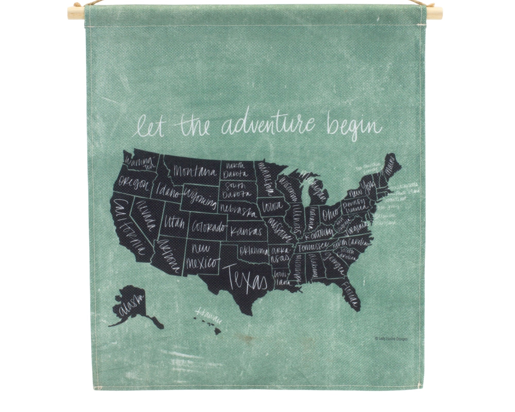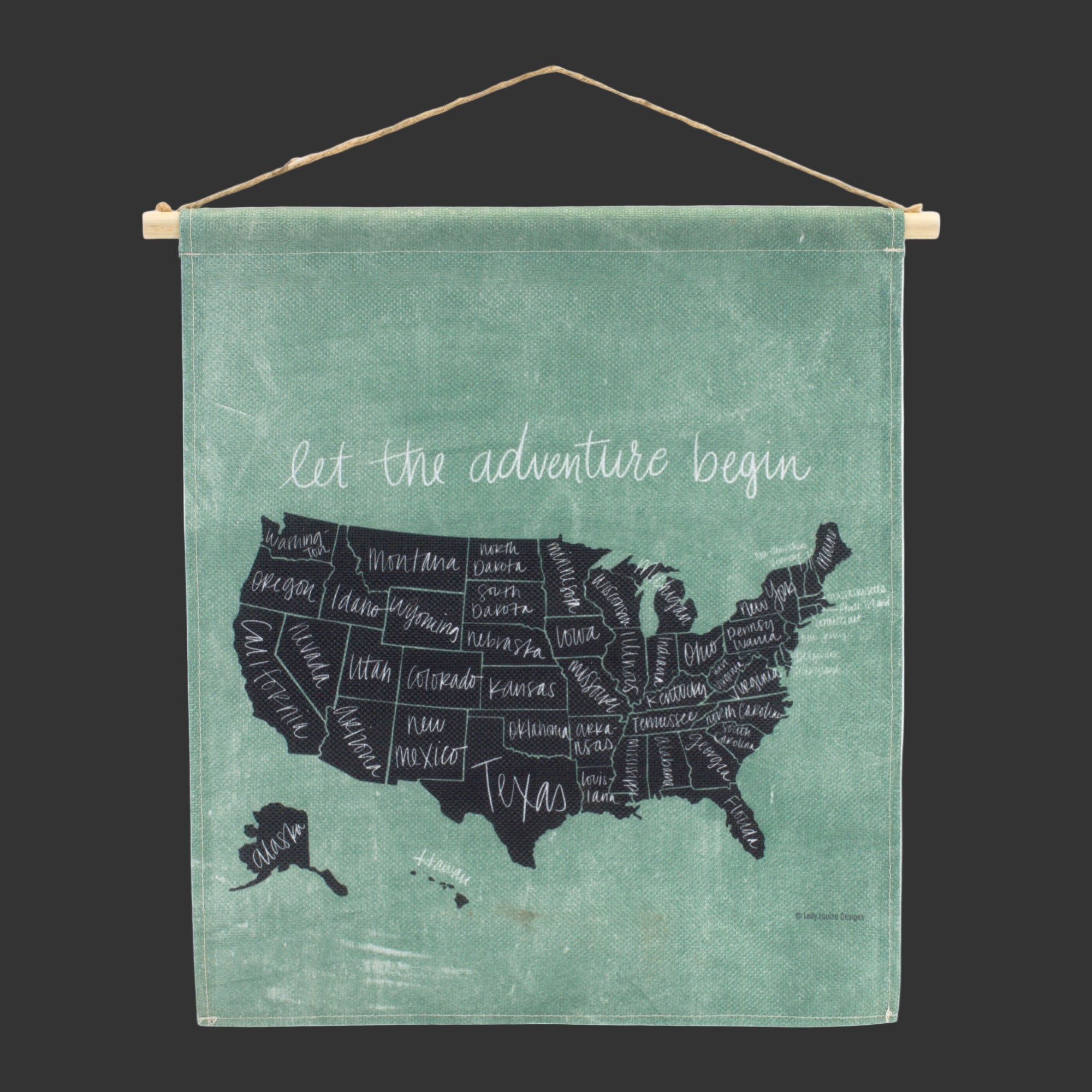 Celebrate adventure and American charm with this United States Linen Wall Hanging, beautifully crafted from soft linen and natural fir wood. Measuring 15" W × 18.5" H × 0.5" D, this hanging décor features a whimsical U.S. map paired with the inspiring sentiment “Let the adventure begin.”