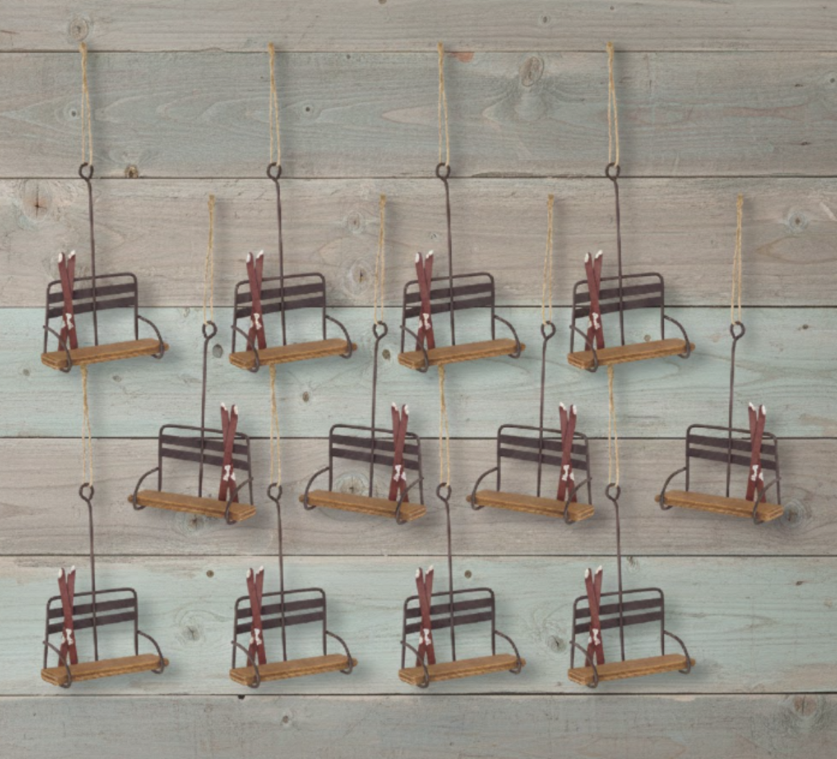 The Ski Chair Lift Ornament Set adds a nostalgic winter touch to holiday decorating with its detailed wood and metal construction. Each ornament features a miniature chair lift design in warm brown and tan tones, creating a rustic lodge-inspired look for your Christmas tree. The compact 5.25-inch size makes them easy to hang while offering noticeable charm among tree branches or wreaths. Crafted from durable materials, these ornaments provide long-lasting seasonal appeal for both gifting and collecting. Sold as a coordinated set of twelve matching pieces, they bring a cohesive and festive winter theme to any holiday display.