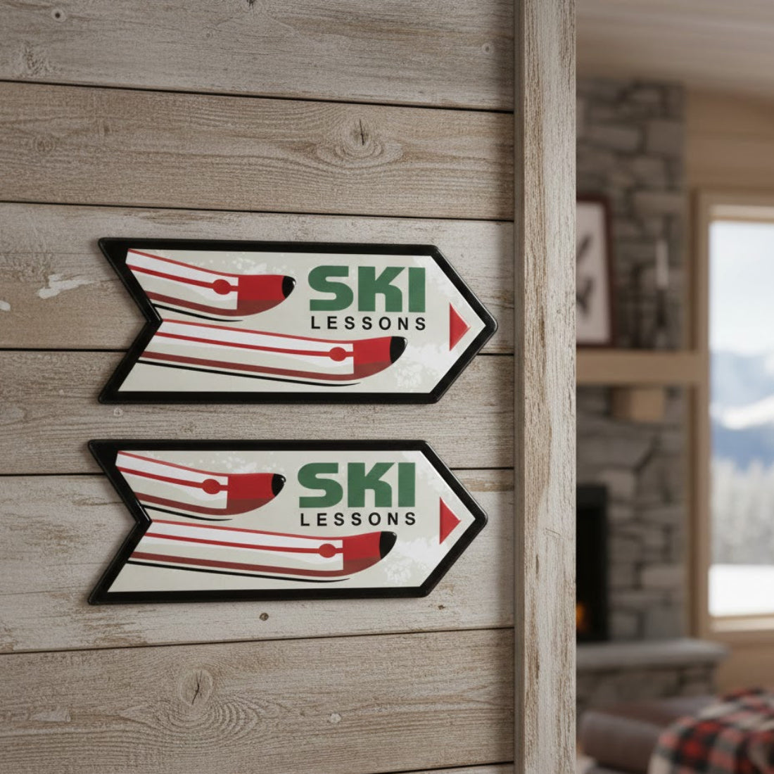 - Metal wall signs with ski lessons arrow design