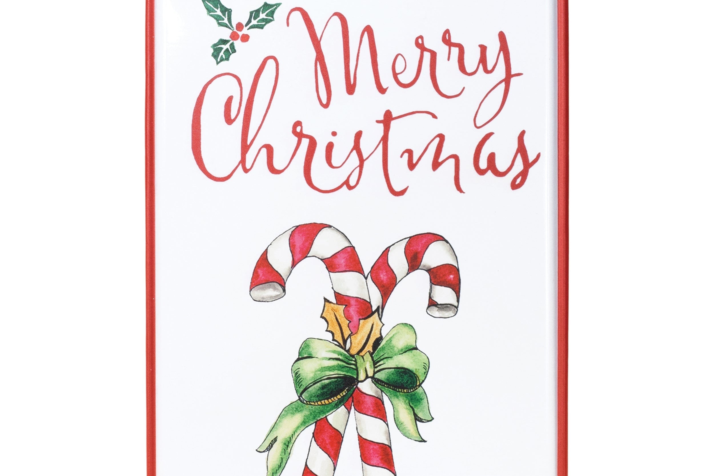 Add festive charm to your holiday decor with this Metal Merry Christmas Plaque, crafted from durable iron and designed in classic red, white, and green tones. Measuring 12.25" L x 18.25" H x 0.25" D, it features elegant “Merry Christmas” cursive lettering, a bold red border, and delightful candy cane and bow accents. Easy-to-use nail holes on the back make hanging simple and secure.