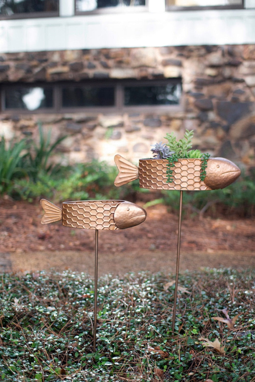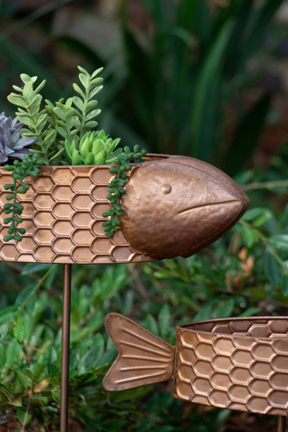 Bring life and character to your garden with this set of two metal fish planter yard stakes in a warm copper finish. Crafted from durable metal, each fish-shaped planter is designed to hold small plants or succulents while adding a playful aquatic touch to your outdoor space. Ideal for gardens, patios, or walkways, these weather-resistant yard stakes feature sturdy posts for easy placement in soil or planters. Their copper tones naturally complement greenery and flowers, creating a balanced blend of art and nature. Perfect for those who enjoy whimsical yet elegant outdoor decor.