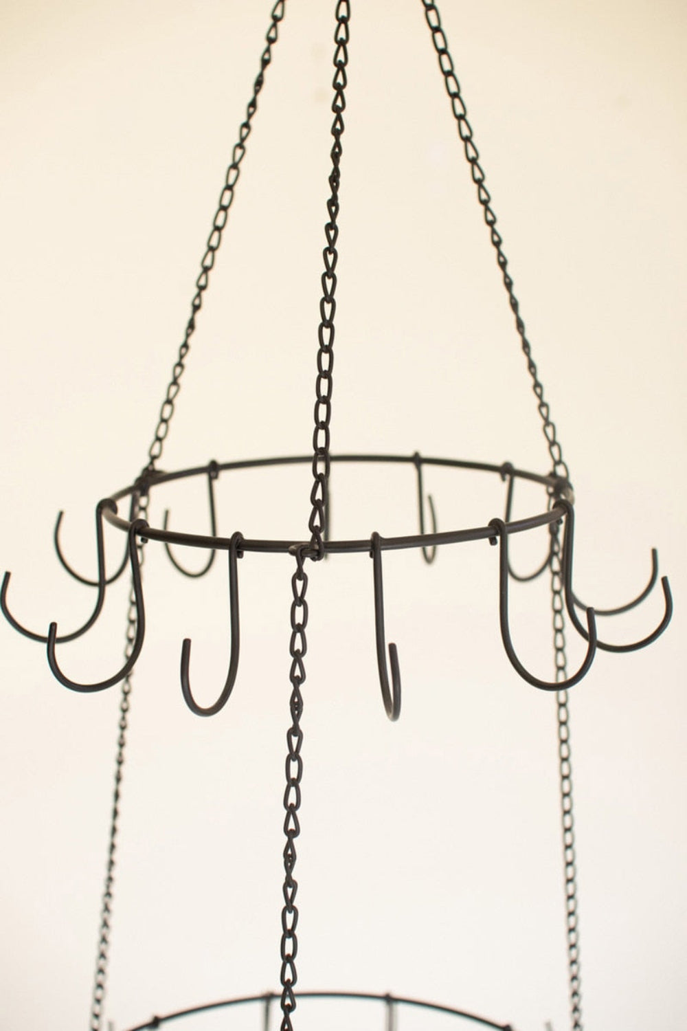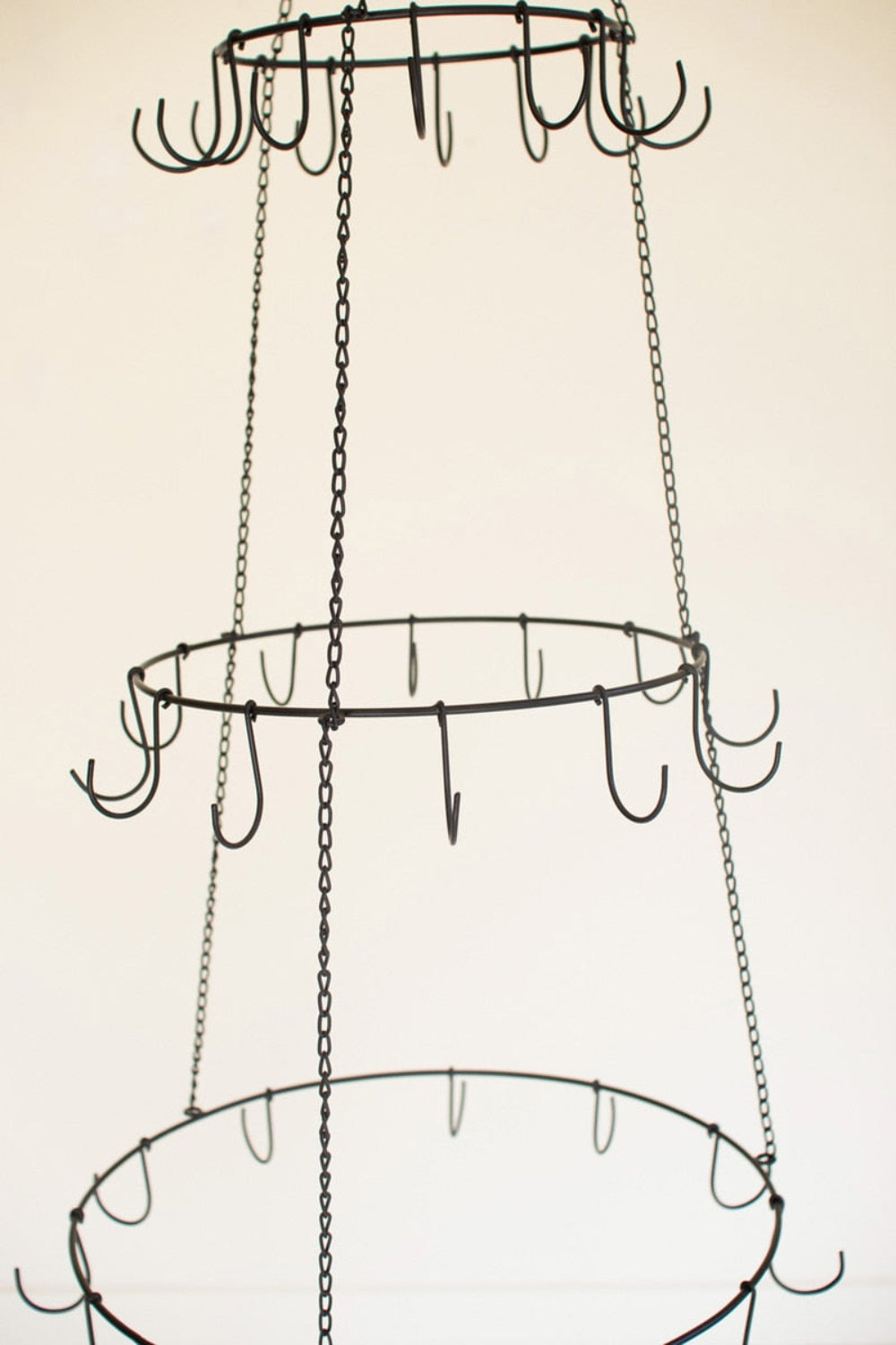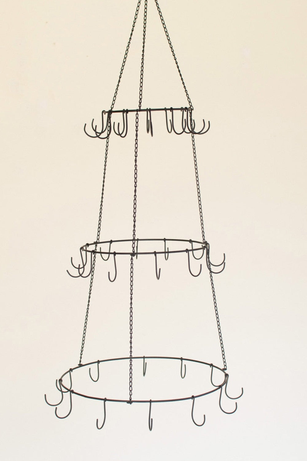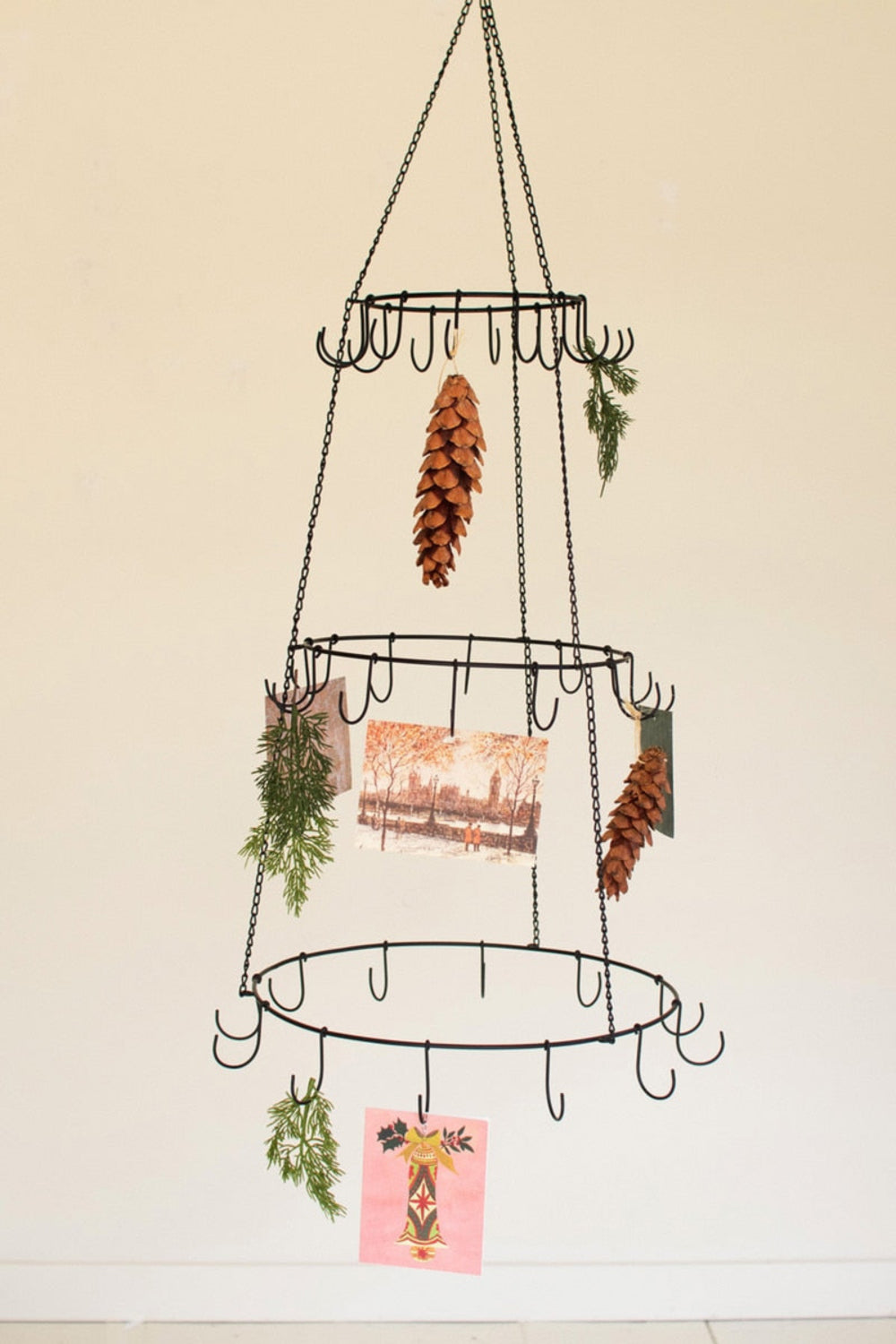 Display your favorite ornaments in style with this three-layer hanging wire ornament tree by Kalalou. Crafted from sturdy wire with a rustic finish, this vertical display features three circular tiers for hanging holiday ornaments, trinkets, or small decor items. The rings measure 16"d, 12"d, and 8"d, suspended from a 16-inch hanger, creating a balanced and elegant silhouette. Measuring 19.5" x 19.5" x 43"t, it’s perfect for adding vertical interest to seasonal spaces without taking up floor room. Ideal for holiday displays, retail setups, or creative home decor, this piece blends functionality with festive charm.