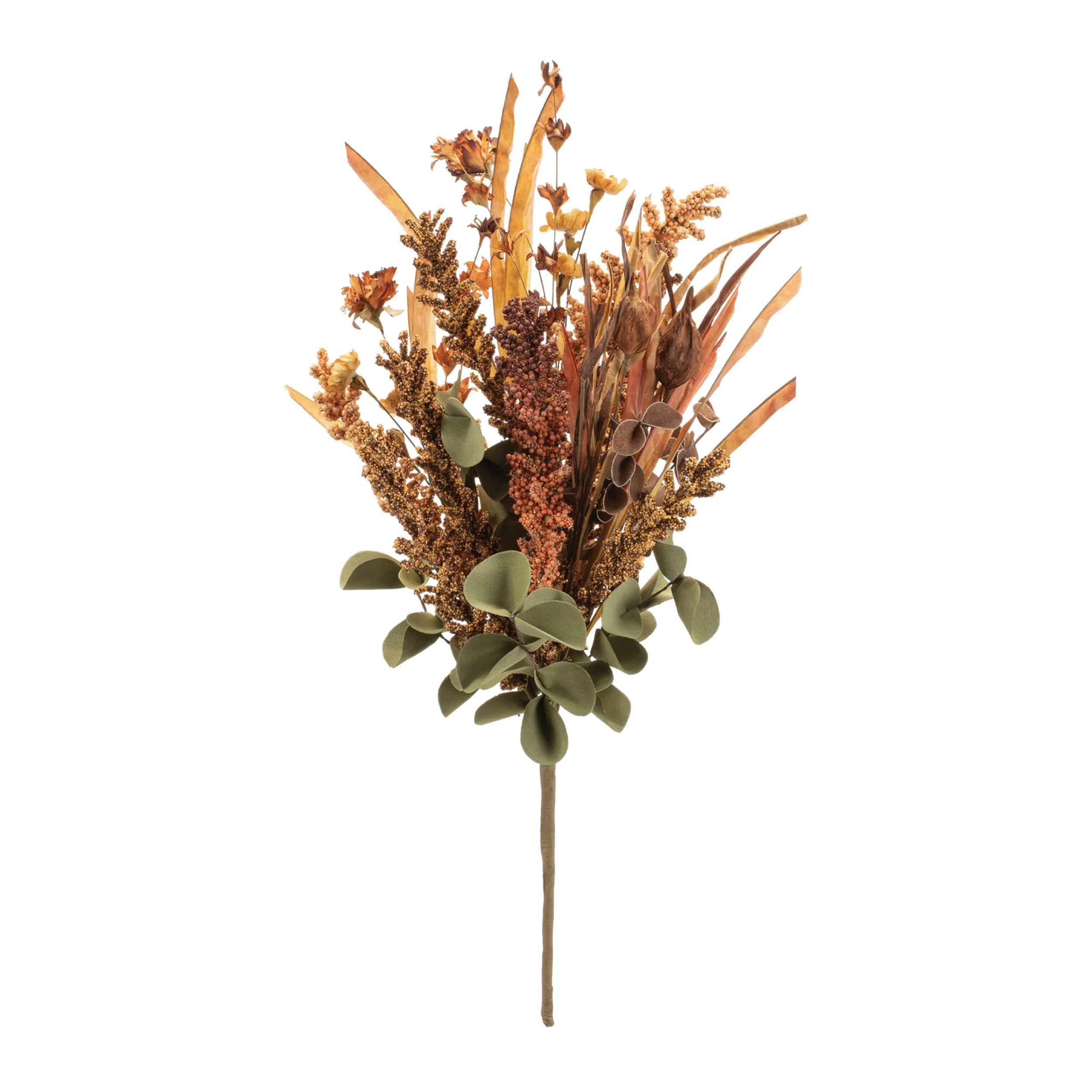 - Features grasses, eucalyptus leaves, seed plumes, and floral stems