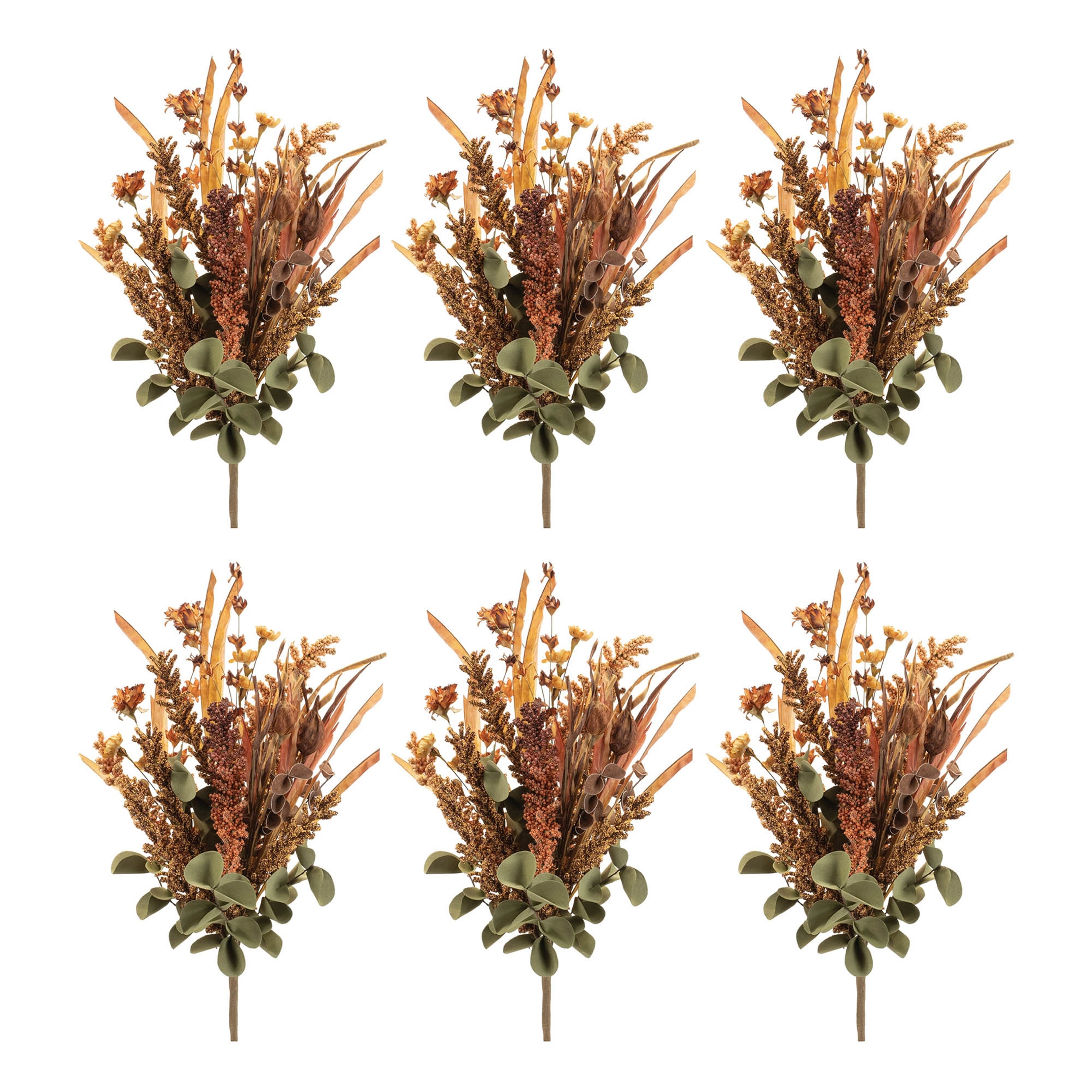 Fall floral bushes add seasonal color and texture to autumn décor. This set includes six mixed fall bushes featuring warm orange, brown, and green tones for a natural harvest-inspired look. Each bush blends a variety of foliage and floral elements, including grass stems, eucalyptus leaves, seed plumes, and floral accents. Crafted from Styrofoam, paper, and iron, the wired stems provide structure and flexibility for easy arranging. Designed for use in vases, wreaths, garlands, or seasonal displays, these fall bushes bring depth and visual interest to Thanksgiving décor and autumn home styling.