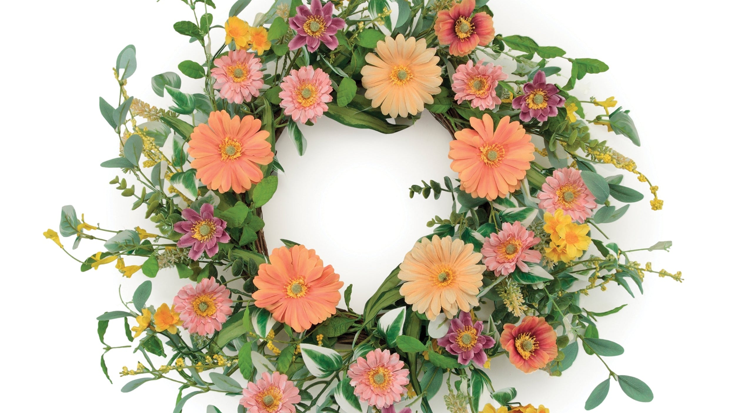 Mixed Gerbera Daisy Wreath 24"D, Pink & Orange Polyester with Foliage on Grapevine Base By Melrose