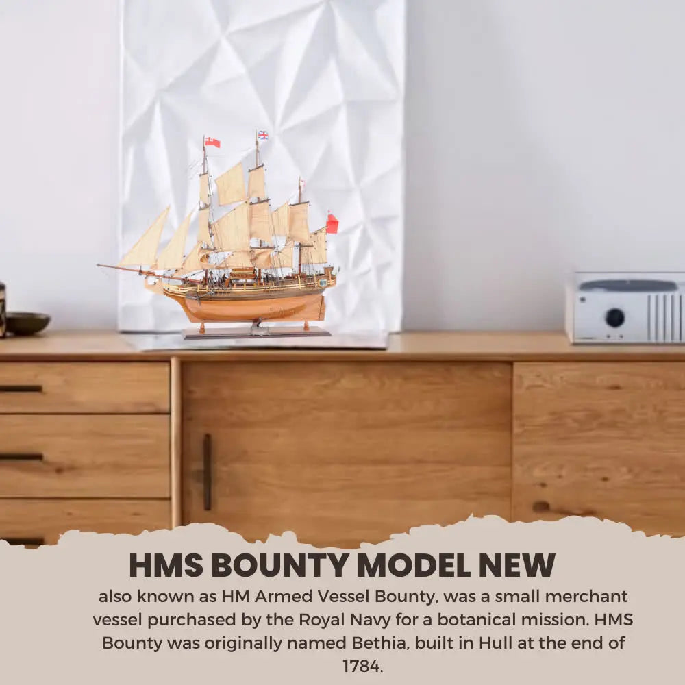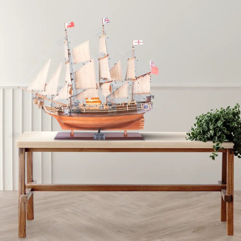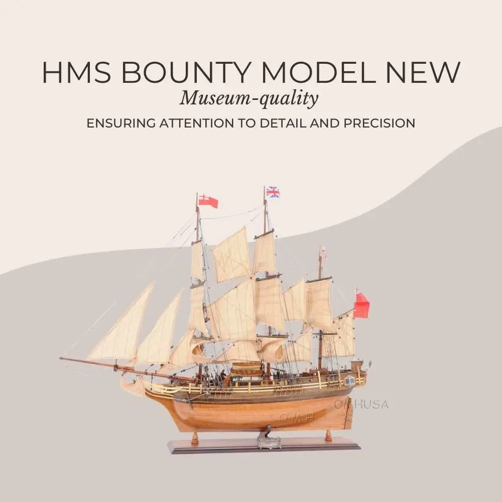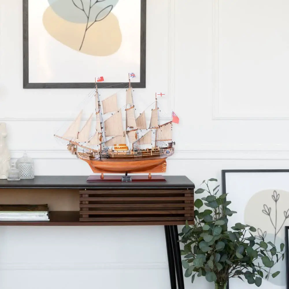 This museum-quality HMS Bounty replica is a fully assembled tall ship model handcrafted from premium woods like western red cedar, rosewood, and mahogany. As part of our Exclusive Edition, each model is laser-etched with a unique serial number on the hull. Built using plank-on-frame construction, it features three detailed decks, brass statues, lifeboats, rigging, and hand-stitched sails. Admirer favorites include the ornate admiral’s quarter, wooden crane, bell tower, and detailed stern with metal lanterns and anchors. With over 100 hours of expert craftsmanship behind every model, this historic piece is ready to display on a solid wood base with a brass nameplate. Ideal for collectors, nautical decorators, or anyone drawn to maritime history.